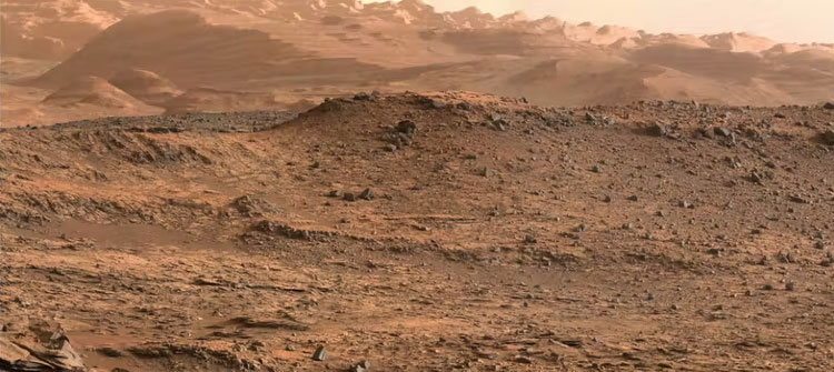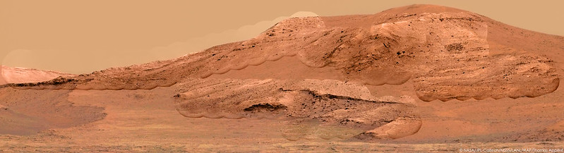 L’aventure sur Mars s’est déroulée de manière nominale au cours de la 1ere année martienne (presque 2 ans terrestres). La NASA a décidé ensuite de prolonger la mission afin d’explorer d’autres formations géologiques. Au milieu du cratère Gale, s’élève le pic central qui culmine à plus de 5 500 m au-dessus du plancher. Il se nomme Aeolis Mons, plus familièrement appelé Mont Sharp. Il expose sur ses flancs de nombreuses couches géologiques dont l’empilement constitue un livre ouvert sur l’histoire de la planète. À moins de 10 km du lieu d’atterrissage de Curiosity, il existe des voies d’accès au Mont Sharp empruntées par le rover autour du Sol 750.