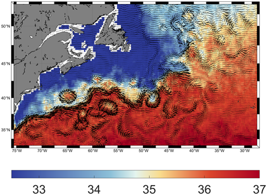 La résolution de SMOS est suffisante pour suivre la salinité dans les grands tourbillons marins qui traversent les grands fronts océaniques comme le Gulf Stream.