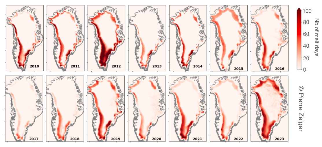 L'eau de fonte des glaces percole dans le manteau neigeux, ou forme des lacs à la surface, ce qui peut déstabiliser les calottes de glace. Les données SMOS fournissent la série la plus longue de détection de la fonte des glaces, pour en observer les tendances dans le contexte du changement climatique.
