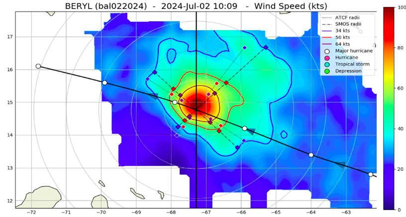Les observations en bande-L sont peu affectées par l'atmosphère. Cela permet d'estimer les vitesses des vents violents en surface sous les cyclones, quand les autres modes d'observation sont soit saturés, soit bloqués par les masses nuageuses.