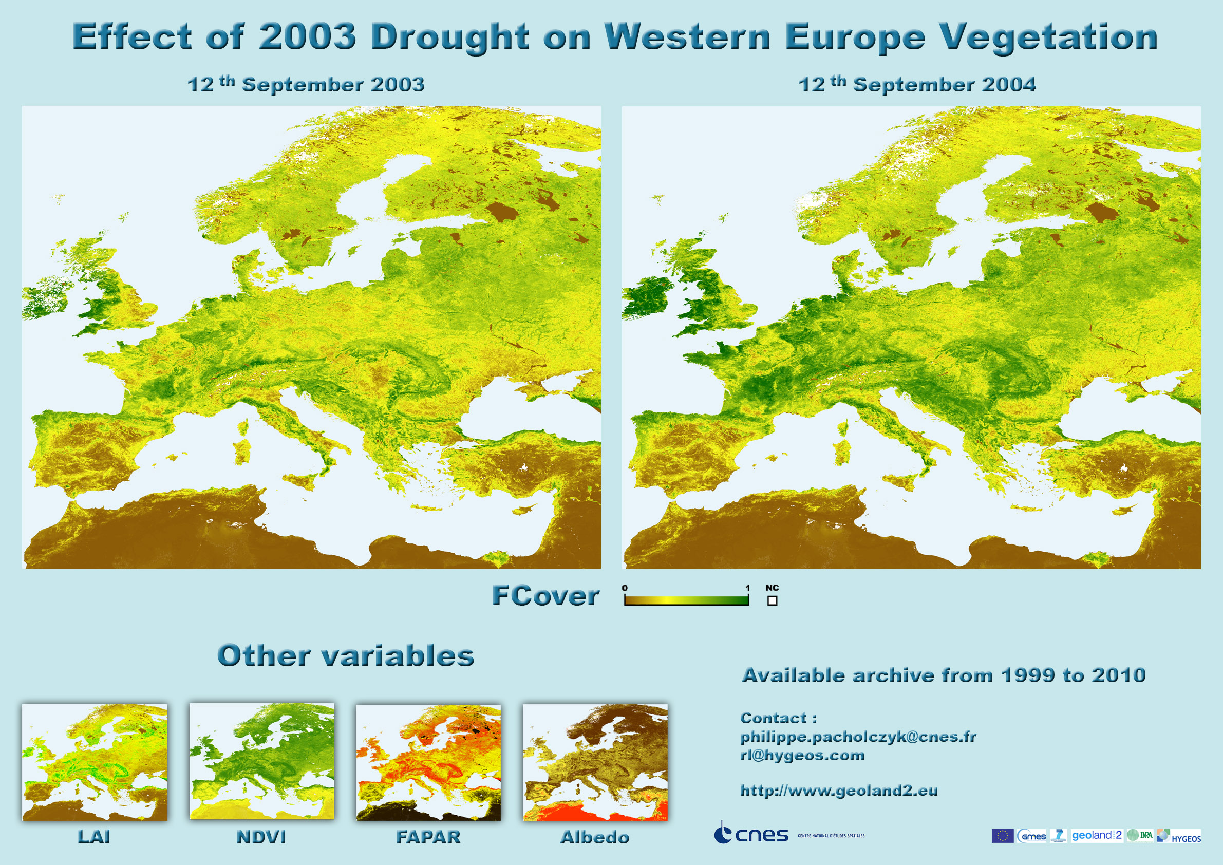 Par exemple, les cartes ci-dessous montrent l’effet de la sécheresse de 2003 en Europe de l’Ouest : le taux de végétation verte est sensiblement moins élevé que lors d’une année normale telle que 2004. En confrontant les données historiques aux produits SPOT/VEGETATION courants, il est possible de détecter les anomalies, d’estimer leur ampleur et leurs conséquences pour des applications telles que la gestion des ressources naturelles (eau, forêt, …) ou la prévision des rendements agricoles.
