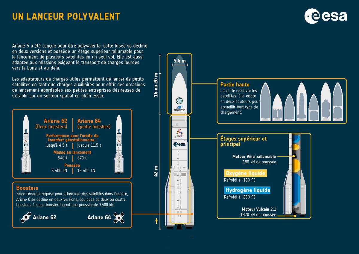 - Ariane 64 (A64), la version qui vole pour la première fois ce jeudi, est quant à elle dotée de quatre boosters P120C. Elle est conçue pour les lancements commerciaux lourds, comme les satellites de télécommunications ou les grandes constellations, avec une capacité de 11,5 tonnes en GTO et jusqu’à 21,6 tonnes en LEO — soit plus du double de l’A62.