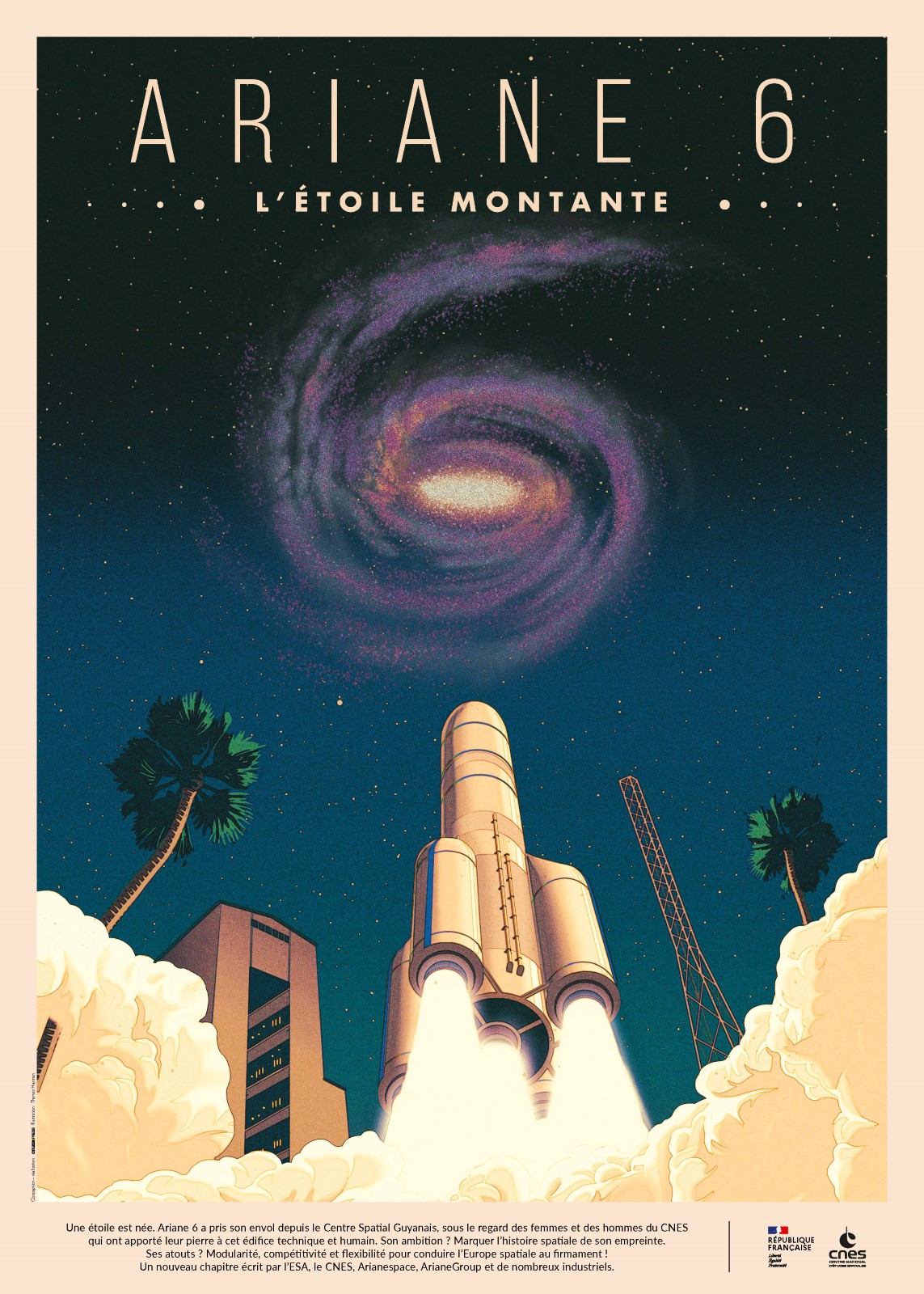 Après la réalisation de l’affiche « Ariane 5, star des podiums » en 2018, l’artiste Thomas Hayman et l’agence Citizen Press ont relevé le défi de proposer un nouveau concept, tout en conservant un lien de parenté avec la précédente.