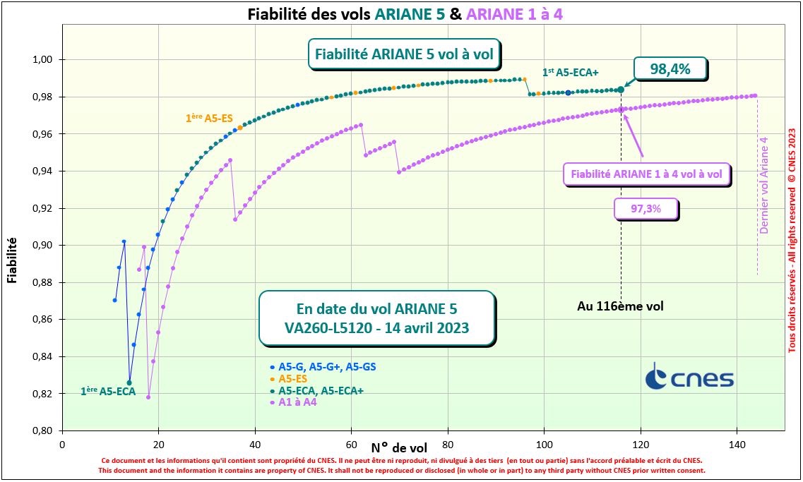 Dans quelques jours, Ariane 5 s’élèvera pour la dernière fois du pas de tir de Kourou pour la mission VA261, emportant 2 satellites. Ce 117e vol du lanceur européen mettra un terme à une carrière de 27 ans, marquée par une fiabilité exceptionnelle. Cette performance est mesurable par une probabilité de succès calculée au fil du temps, après chaque lancement, et qui indique la capacité du lanceur à réaliser sa mission principale jusqu’au bout, c’est-à-dire jusqu’à la séparation avec les charges utiles sur l’orbite visée. Au-delà du moment le plus spectaculaire du décollage, il prend en compte les phases spatiales hors de l’atmosphère terrestre, qui sont les plus complexes à maîtriser et durant lesquelles se concentrent les risques d’échec, comme une défaillance de la propulsion ou une perte de contrôle. Avant le dernier vol, cette probabilité de succès s’établit pour Ariane 5 à 0,984, soit 98,4%.