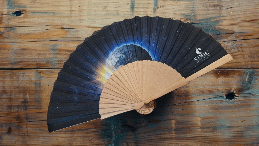 Oui, d’accord, les grandes chaleurs sont derrière nous ! Mais avouez qu’il a du style. Avec son graphisme inspiré de l’univers spatial, l’éventail « made in CNES » est un objet à la fois utile et élégant, conçu pour porter nos couleurs et nos valeurs. Fabriqué en Europe, il allie qualité de fabrication et sélection rigoureuse des matériaux et a été conçu dans une démarche responsable.