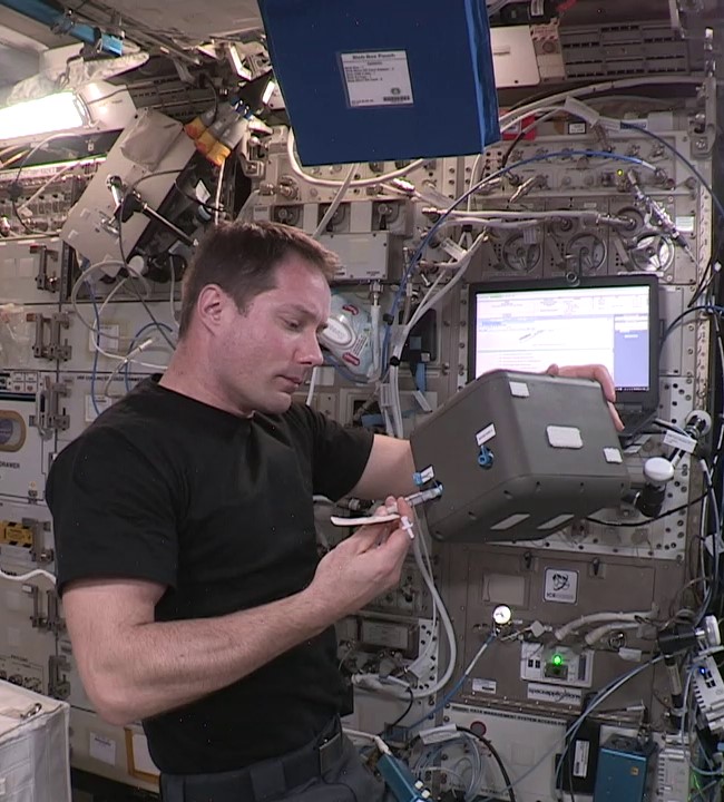 Jeudi 2 septembre 2021, 13h14 CET : Thomas Pesquet démarre l’installation de l’expérience Blob-ISS. Il sort la blob-box de sa trousse de transport, insère une carte micro-SD sur le dessus de la boîte et dose quatre seringues avec 0,3 ml d’eau pour hydrater chacun des blobs. Une opération qui lui prend en tout 30 minutes, l’heure de début et de fin des opérations étant minutieusement transmises par l’astronaute aux centres de contrôle sur Terre.
