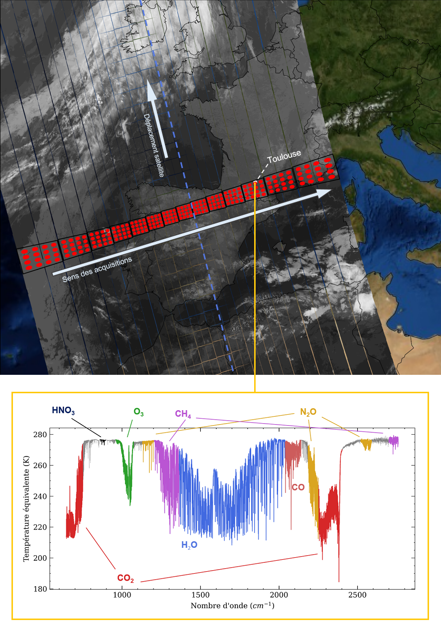 Le 30 septembre, IASI-NG a donc livré sa première mesure complète au-dessus de Toulouse. Couplé à une image infrarouge, acquise grâce à son imageur, ce spectre nous informe déjà sur de présence de nombreux composés chimiques dans les différentes couches de l’atmosphère.