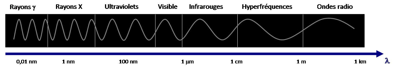 Un spectre électromagnétique est une représentation de l’énergie des particules émises par une source en fonction de sa fréquence d’oscillation (ou longueur d’onde). Ces particules sont émises par des sources variées comme le Soleil, la Terre, les étoiles, etc. Dans ce spectre, on retrouve la lumière visible, les ultraviolets, les infrarouges ou encore les ondes radios.