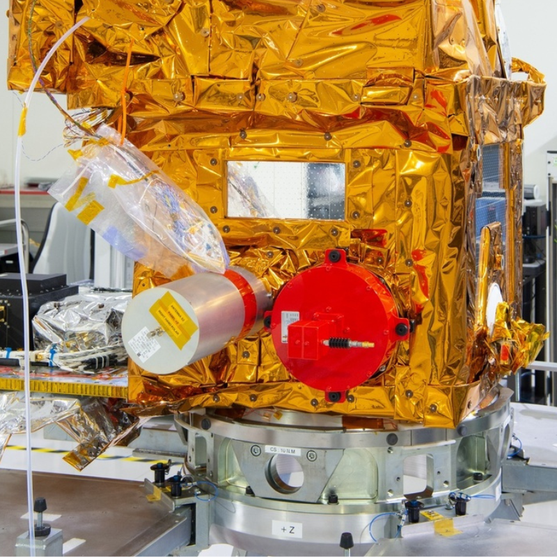 « À l’intérieur de l’instrument, on trouve un système de pointage et de calibration équipé d’un miroir, un télescope et un spectromètre. En entrée de l’instrument, le miroir optique dirigé vers la Terre sert à capter la lumière : il est protégé derrière la bâche grise en forme de rectangle allongé pour éviter tout dépôt de poussière, et ce, même si on se situe en salle blanche ! Sur la face non visible de l’instrument (à gauche sur la tranche), on trouve un radiateur : il maintient la température du boîtier de contrôle – la tour de contrôle des équipements électroniques – entre -7°C et 25°C. »