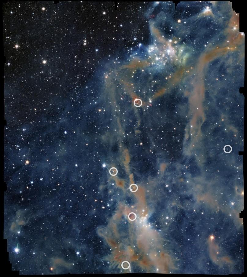 Cette nébuleuse regorge d'étoiles très jeunes. Certains des objets enfouis dans cet environnement poussiéreux rejettent de la matière, signe que des étoiles sont en train de se former. En zoomant sur l'image, ces flux apparaissent sous forme de taches et de spirales de couleur magenta. Le cercle en haut de l'image point par exemple sur la jeune étoile HOPS 221. Située au centre sous deux étoiles brillantes, elle projette beaucoup de matière, rose à blanche.