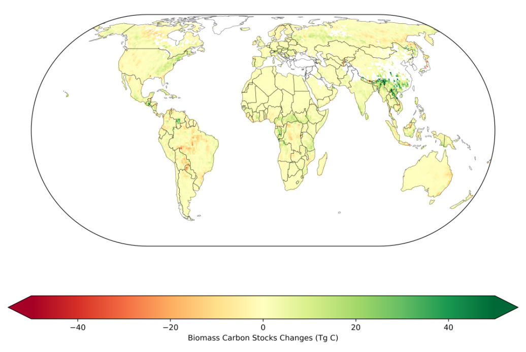 Le résultat, visible ci-dessous, montre que certaines régions du monde gagnent de la biomasse et stockent le carbone (en vert), tandis que d’autres, surtout touchées par la déforestation, sont plutôt émettrices (en rouge).