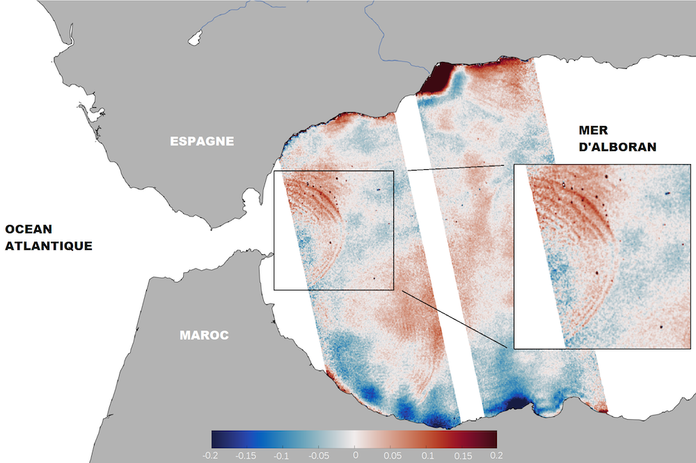 Sur l’image ci-dessus, la mission SWOT livre une observation détaillée du phénomène d’ondes internes au niveau du détroit de Gibraltar. La configuration de la côte et le relief sous-marin provoquent des ondes dans le sillage du détroit. Les données acquises par le satellite en nuances de bleu et de rouge représentent les hauteurs de mers par rapport à un niveau moyen “0” en blanc et laissent apparaître les ondes qui se dirigent vers l'intérieur de la Mer Méditerranée.