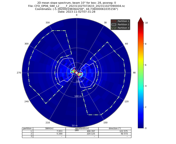 Le spectre ci-dessus peut être visualisé sur le tracé ci-dessous où les trois paramètres sont indiqués via un vecteur dont la norme donne la longueur d’onde et le code couleur la hauteur des vagues.