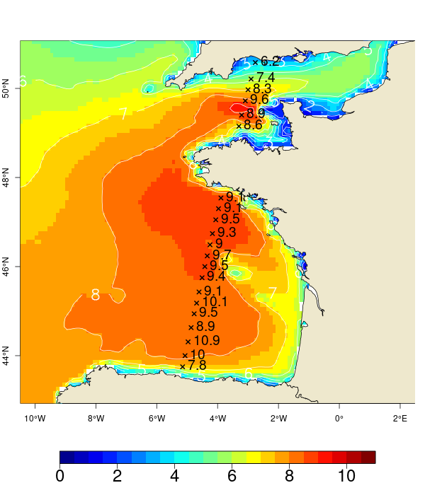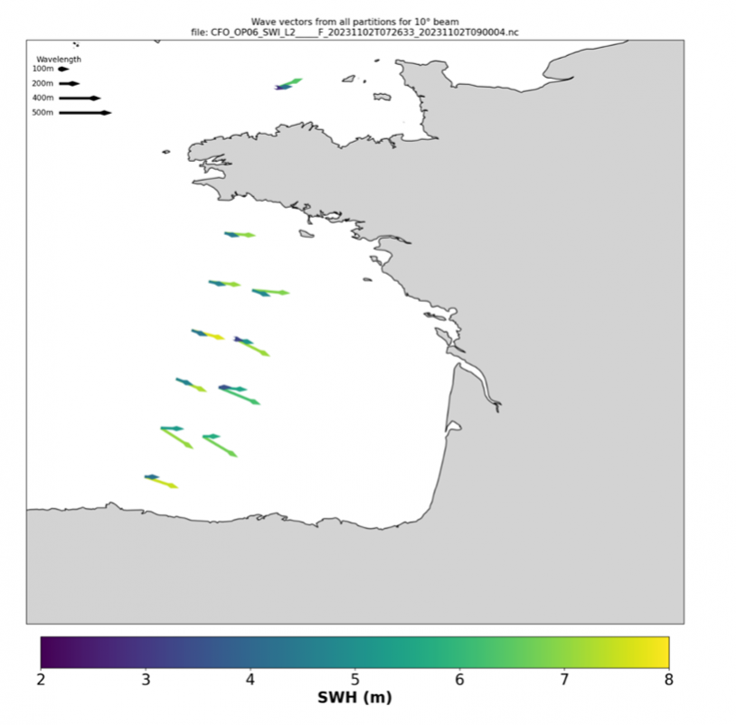 Elles sont représentées par des croix noires et sont superposées à une carte de prévision marine proposée par Météo France exprimée en mètres. On observe, pour la hauteur des vagues, une grande cohérence avec les prévisions. L’instrument SWIM a pu enregistrer des vagues dont la hauteur significative a atteint près de 10 mètres à quelques dizaines de kilomètres au large des côtes bretonnes.