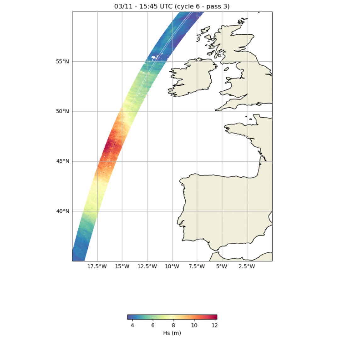 Peu de temps après CFOSAT, le 03/11/2023, le satellite SWOT, développé en coopération entre le CNES et la NASA, a pu être témoin du passage de la tempête Domingos au large de l’océan Atlantique. Les données acquises par les instruments KaRIn et Poséidon-3C embarqués à bord du satellite montrent, avec une très bonne cohérence, des hauteurs significatives de vagues atteignant 12 mètres.