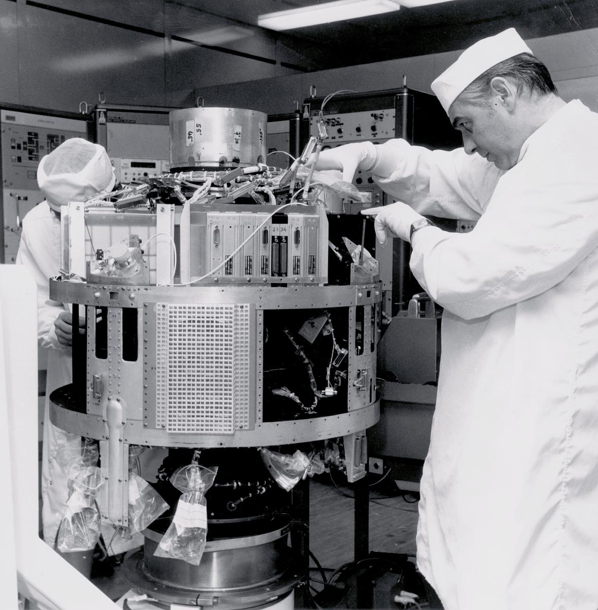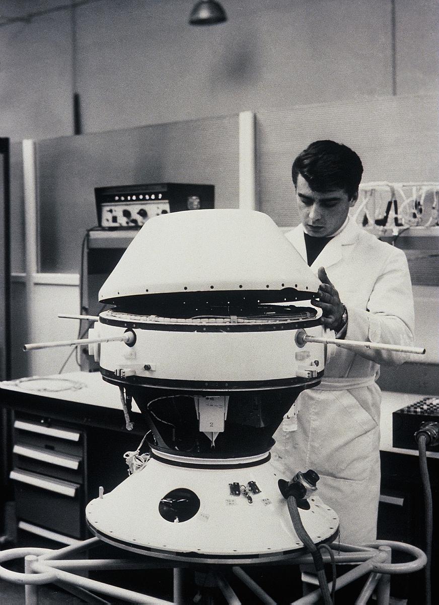 « On fait un petit saut dans le temps, avec cette image, montrant le satellite Aura en train d’être assemblé. Il sera lancé par la toute dernière fusée Diamant en 1975. » Ce petit engin (115 kg) faisait partie d’un ambitieux programme d’astronomie. Il était chargé d’étudier le rayonnement ultraviolet provenant du Soleil, et son absorption par l’atmosphère. « Ce qu’il faut savoir en effet, c’est que, parallèlement au développement du programme spatial militaire, la France développe, dès la fin des années 1950, un programme spatial civil » scientifique. C’est ainsi qu’est créé en 1959, le Comité des recherches spatiales (CRS). Puis le CNES, en 1962, avec une « division satellites » chargée de développer des engins à visées scientifiques. « En décembre 1965, 10 jours après le lancement d’Astérix, le satellite France-1 (Fr-1), premier satellite scientifique du CNES, rejoint l’orbite terrestre – à bord d’une fusée américaine. Son objectif était d’étudier la propagation des ondes dans l’ionosphère. »