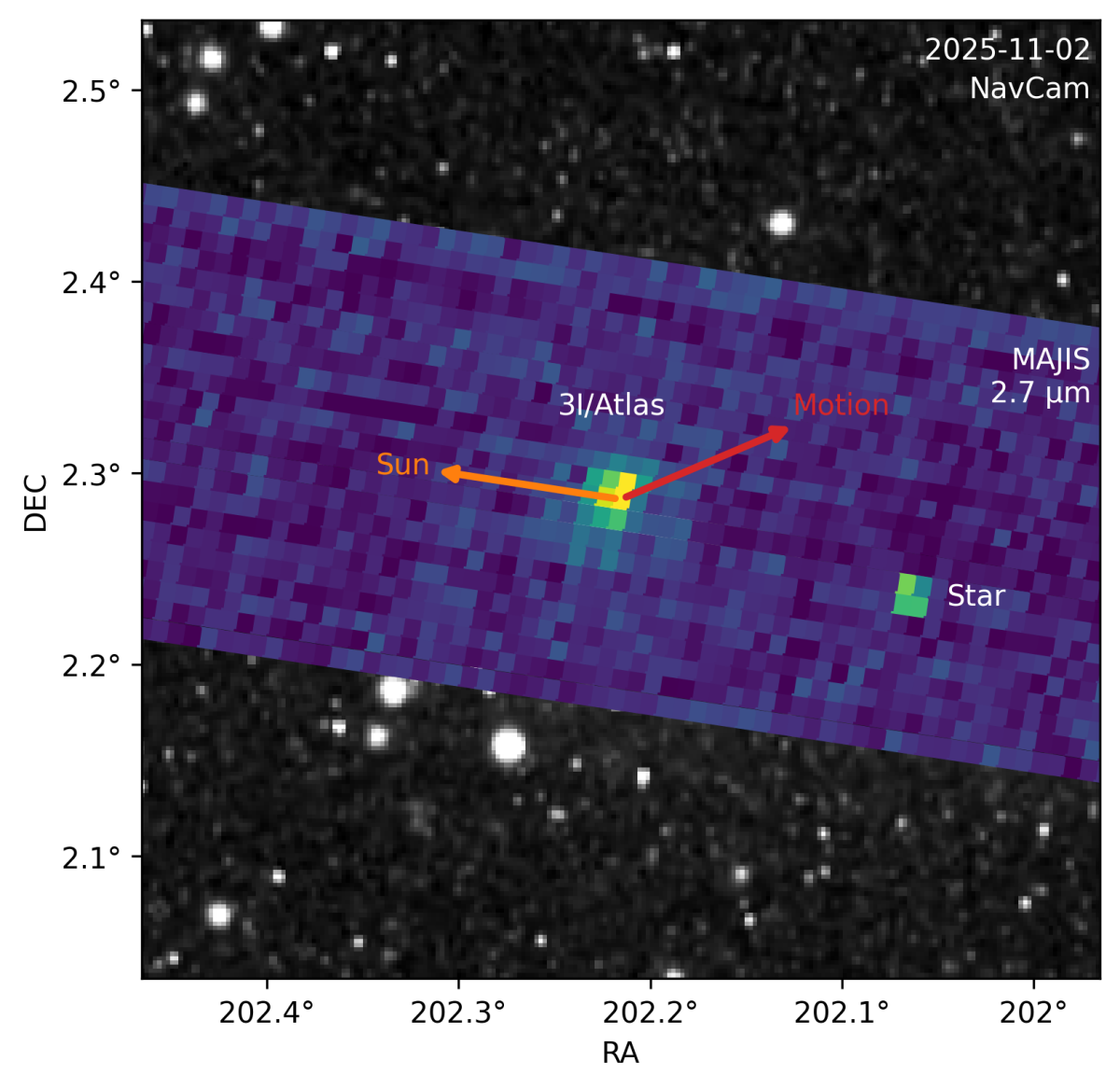 Parmi eux, l’instrument MAJIS (Moons And Jupiter Imaging Spectrometer) a identifié des émissions infrarouges de vapeur d’eau (H2O) et de dioxyde de carbone (CO2), ainsi que la diffusion de la lumière par la coma dans le visible/proche-infrarouge, le 2 novembre 2025, soit quatre jours après le passage au périhélie du 29 octobre 2025. D’autres émissions plus faibles ont également été observées les 12 et 19 novembre.