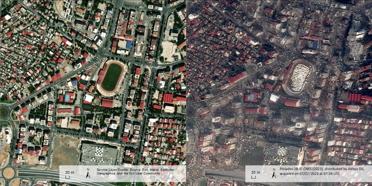 Le 6 février 2023, la Syrie et la Turquie sont frappées par un puissant séisme de magnitude 7,8. Dès le lendemain matin, des images fournies par les satellites d’observation de la Terre permettent d’évaluer l’étendue des dégâts. Sur les images ci-dessous, on observe des bâtiments effondrés et des tentes déployées dans le stade pour les habitants réfugiés de la ville Kahramanmaras.