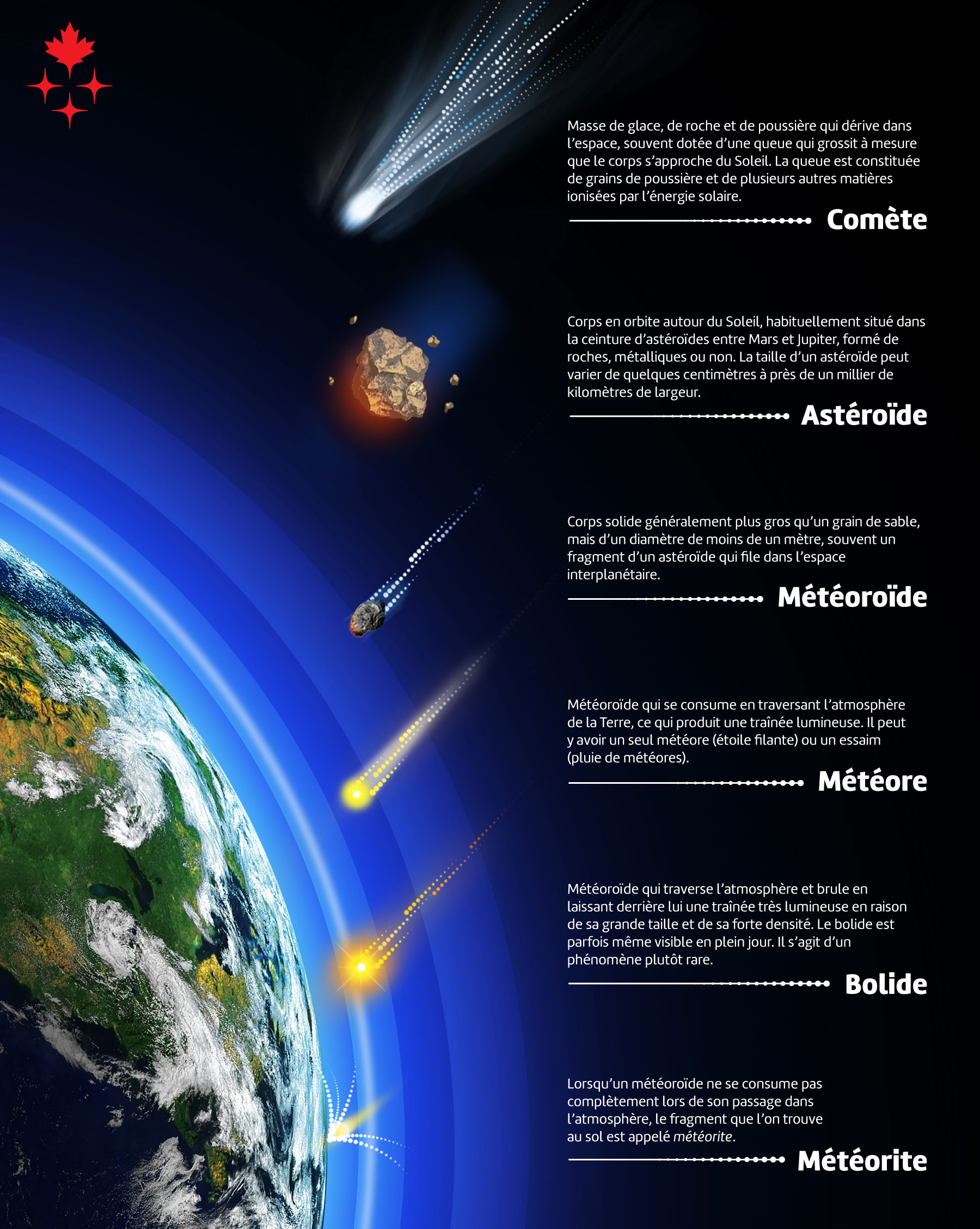 Astéroïdes et comètes sont ce qu’on appelle les petits corps du Système solaire. Si les comètes sont actives à l’approche du Soleil, les astéroïdes, petits cailloux de roches et de métaux, sont, eux, inertes. Les scientifiques ont aujourd’hui recensé 1,4 millions de ces petits corps qui orbitent autour de notre étoile, dans différentes régions plus ou moins lointaines : la plupart sont des astéroïdes mais il y a également 4 500 comètes et 5 planètes naines (corps sphériques comme les planètes mais pas assez massifs pour avoir fait le ménage sur leur orbite). Nos connaissances évoluant sans cesse, il faut en effet revoir parfois les définitions et créer de nouvelles catégories.