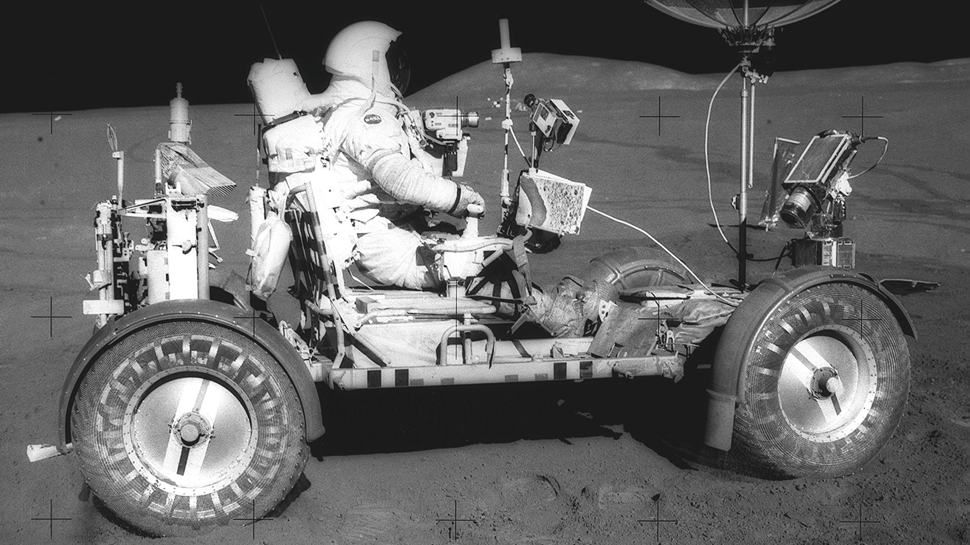 Les 3 rovers lunaires du programme américain Apollo (1971-1972) ont été les « voitures » des astronautes. Ceux-ci ont ainsi pu explorer des zones plus éloignées des sites d’atterrissage, se déplaçant plus vite qu’à pied. Sans excès toutefois : la vitesse de pointe des rovers étaient de 18 km/h !