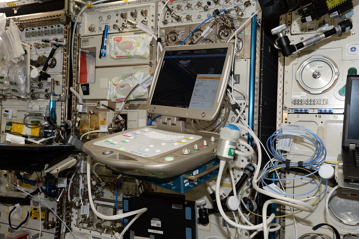 Les scientifiques français ont bien sûr pensé à mener des expériences dans l’espace. Lors du tout premier voyage d’un français dans l’espace (Jean-Loup Chrétien en 1982), une première expérience d’échographie – développée par le CNES – étudie la réaction du cœur et des vaisseaux dans l’espace. Depuis 1998, les astronautes réalisent de nombreuses expériences dans l’ISS. L’échographie reste une technique largement utilisée : en 2017, Thomas Pesquet a pu tester une nouvelle génération d’échographe télécommandé à distance par un médecin, lui permettant de contrôler l’état de la veine porte, la tyroïde et la carotide de l’astronaute.