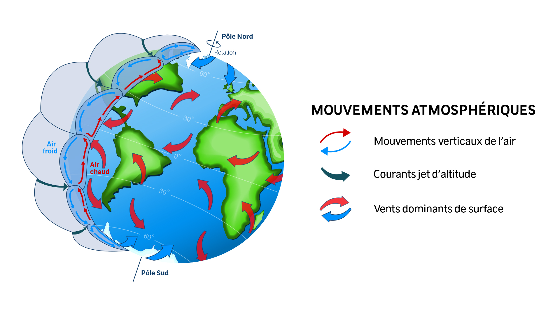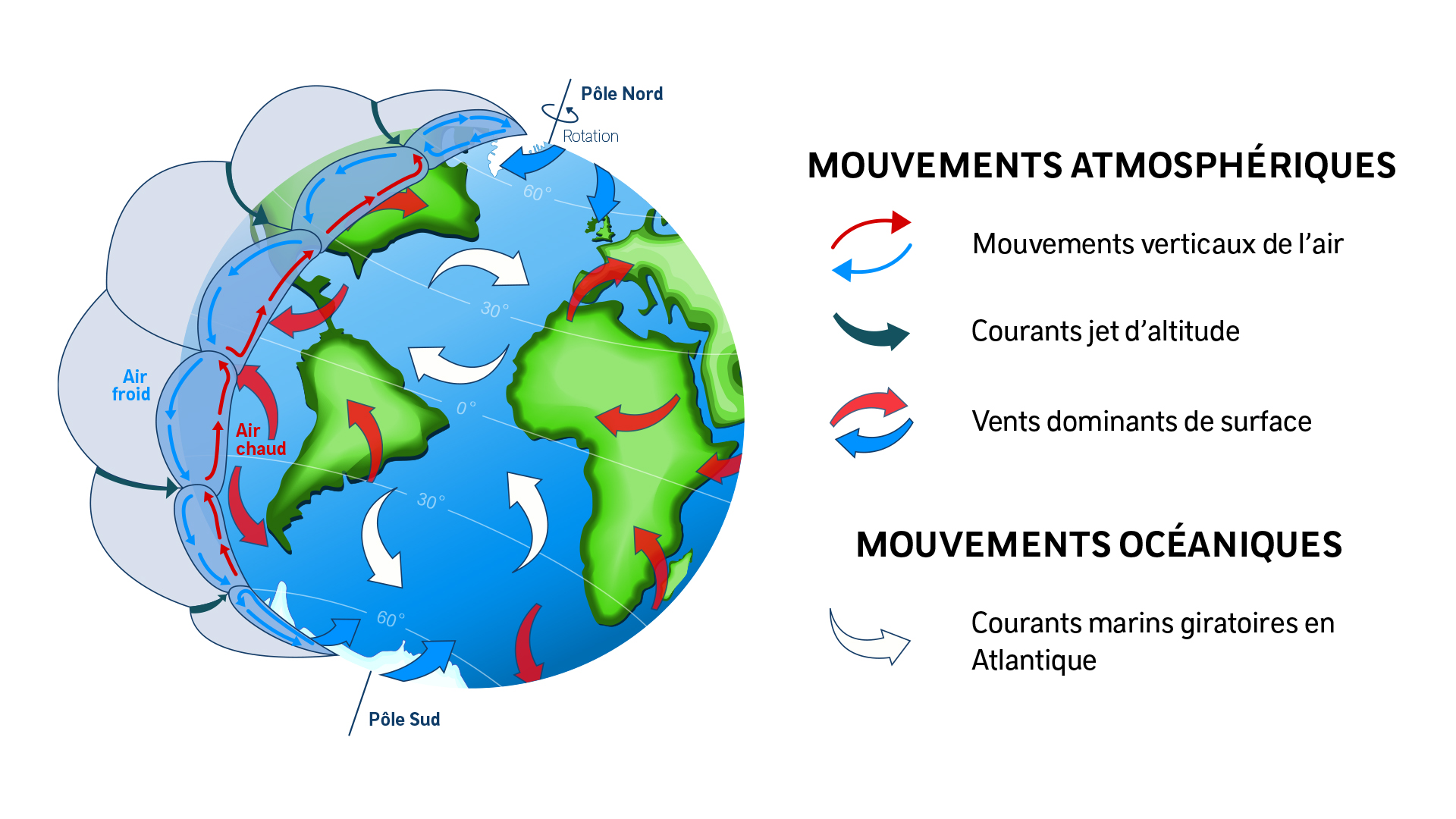 L'énergie excédentaire des zones équatoriales est redistribuée vers les zones polaires par les mouvements de l’atmosphère et de l’océan.