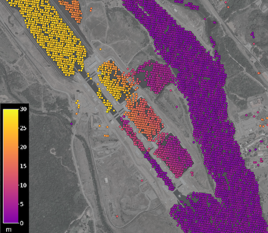 The Panama Canal is another example of the precision of SWOT data. Locks at either end of the canal take ships as far as Lake Gatún, a freshwater artificial lake lying 26 metres above sea level. On average, 200,000 m3 of freshwater is needed for a single ship to pass through a lock, the equivalent of 80 Olympic-size swimming pools. Unfortunately, the region is subject to quite severe droughts and the level of the lake may drop significantly, making the canal unusable or limiting the number of ships. As the canal’s level is naturally measured along its entire length, observing it with SWOT has confirmed the satellite’s potential and accuracy for such complex installations, as shown in the image below.