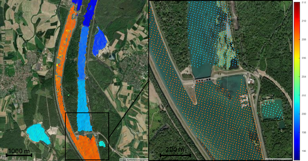 While SWOT data do not measure waterway depth directly, they should tell us if they are navigable or not by comparing them with usual depths to provide operators with navigation bulletins. In Europe, the Rhine is one of the busiest navigable waterways for transporting goods. The river is closely monitored and controlled, enabling SWOT data to be validated and confirming that the mission is accurately estimating water levels on both sides of the river’s dams.