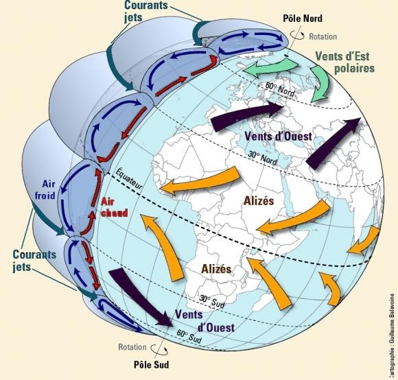 Même si les "courants d'air" et "courants d'eau" sont modifiés par des caractéristiques géographiques locales, les circulations des masses d'air et d'eau s’organisent selon une dynamique générale à l'échelle du globe.