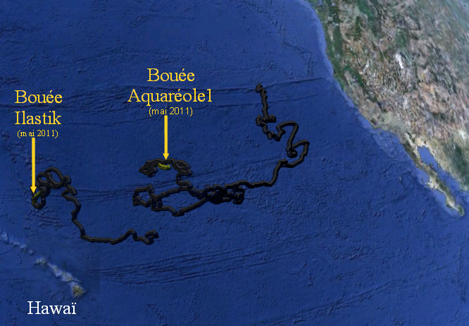 Le suivi des bouées Aquaréole1 et Ilastik montre que celles-ci tournent en rond à cause de la présence de "bosses" sur l'océan. L'influence de la force de Coriolis est vérifiée car la bouée tourne bien dans le sens des aiguilles d'une montre. Quand l'océan est particulièrement plat et les courants géostrophiques faibles, les élèves ont pu vérifier l'influence du vent sur les courants marins qui ont transporté les bouées. Les déchets plastiques font de même, ils tournent en rond et s'immobilisent au cœur de l'océan pour former une île plastique.