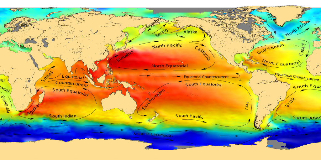 Le déplacement de l'eau dans les océans se fait par les courants marins. Les courants de surface transportent l'eau, chauffée par le Soleil à l'équateur et aux tropiques, vers les latitudes plus tempérées, voire froides. Les grands courants océaniques de surface, générés par les vents dominants, sont déviés par les côtes, et par la rotation de la Terre. La circulation océanique est affaire de creux et de bosses. Dans l'hémisphère Nord, les courants chauds tournent dans le sens des aiguilles d'une montre autour des bosses avec une vitesse proportionnelle à la pente, et les courants froids en sens inverse autour des creux. Dans l'hémisphère Sud, les sens de rotation sont inversés. Ils forment des boucles de part et d'autre de l'équateur, avec des vents dominants d'est (les Alizés). L'eau s'accumule ainsi sur les bords ouest des océans.
