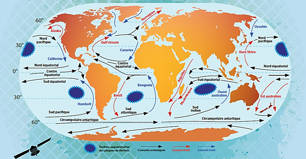 Les satellites montrent qu’à l’échelle du globe les courants s’organisent en gyres, au centre desquels les déchets s’accumulent sur d’immenses surfaces