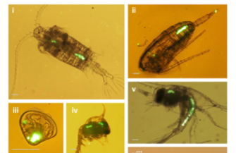 Le plastique (taille de quelques μm) a été rendu fluorescent par une technique de « marquage » utilisée en Bio-imagerie. On l'observe à l’intérieur d’individus de différentes espèces du zooplancton, base des chaînes alimentaires. Cette pollution atteint ainsi l'intégralité de la vie marine.