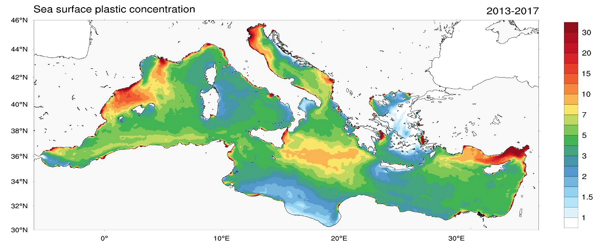 Ainsi, Copernicus for Marine Environment Monitoring Service (CMEMS) vient de proposer une carte de la concentration plastique en Méditerannée obtenue d'après des modèles.