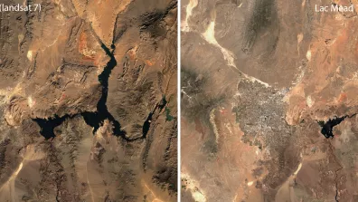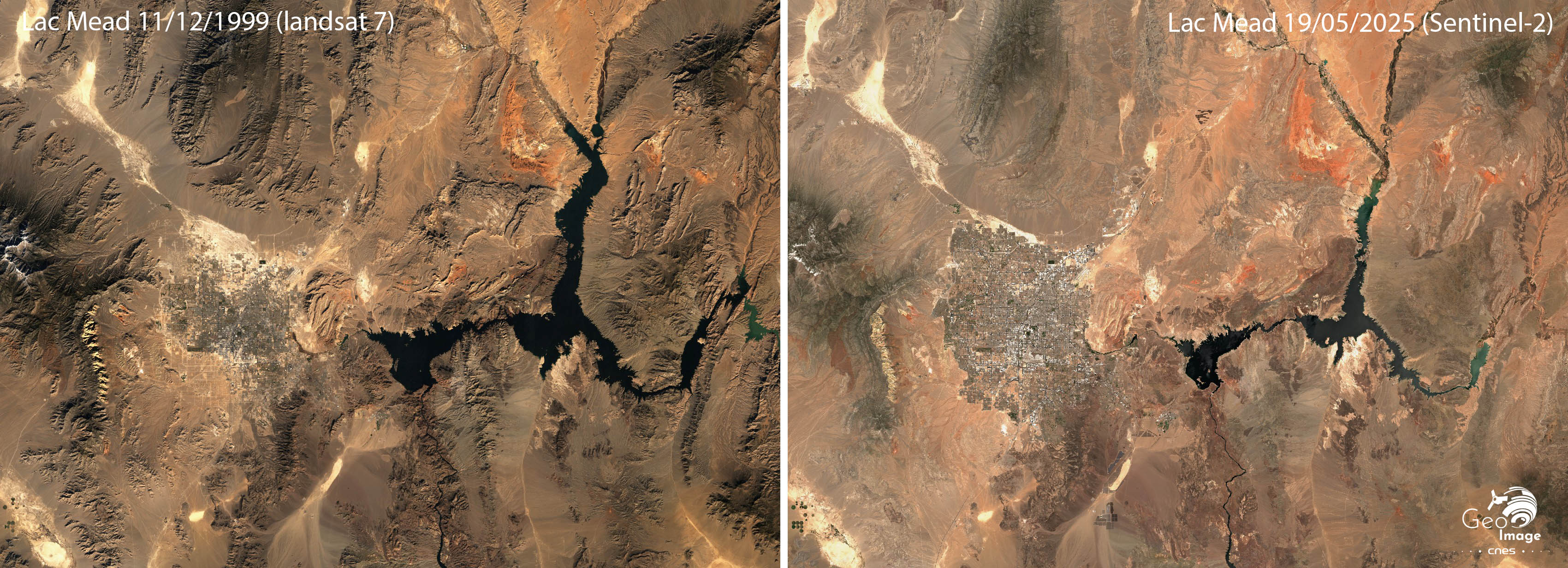 Comme le montre ces images le niveau du lac Mead a baissé entre le mois de mai 2025 (image Sentinel-2), et le mois de décembre 1999 (image Landsat 7). Le lac connait son plus bas niveau historique depuis les années 1930 du fait d’une sécheresse exceptionnelle qui frappe tout l’Ouest des États-Unis. Cet évènement témoigne de la forte réduction des débits du fleuve Colorado dont la ressource en eaux est surexploitée depuis des décennies. Dans ce contexte, les villes - comme ici Las Vegas - et l’agriculture irriguée intensive vont devoir restreindre leurs usages. Cet épisode oblige à s’interroger sur les limites d’un modèle de croissance - urbain et agricole - extensif et les nécessaires réflexions à engager afin de promouvoir un développement réellement durable dans un espace continental semi-désertique.