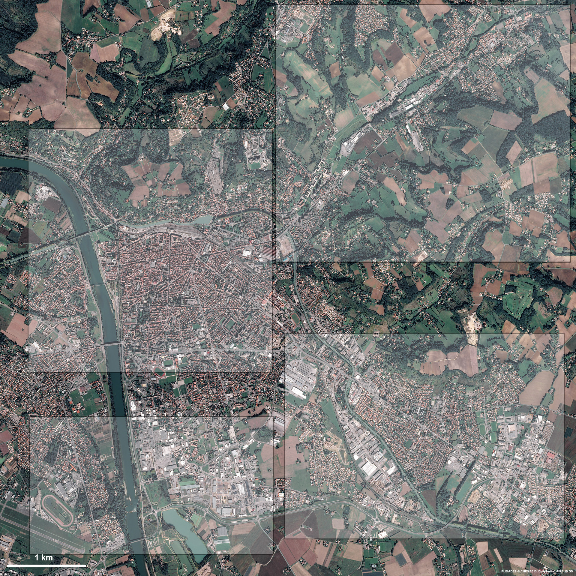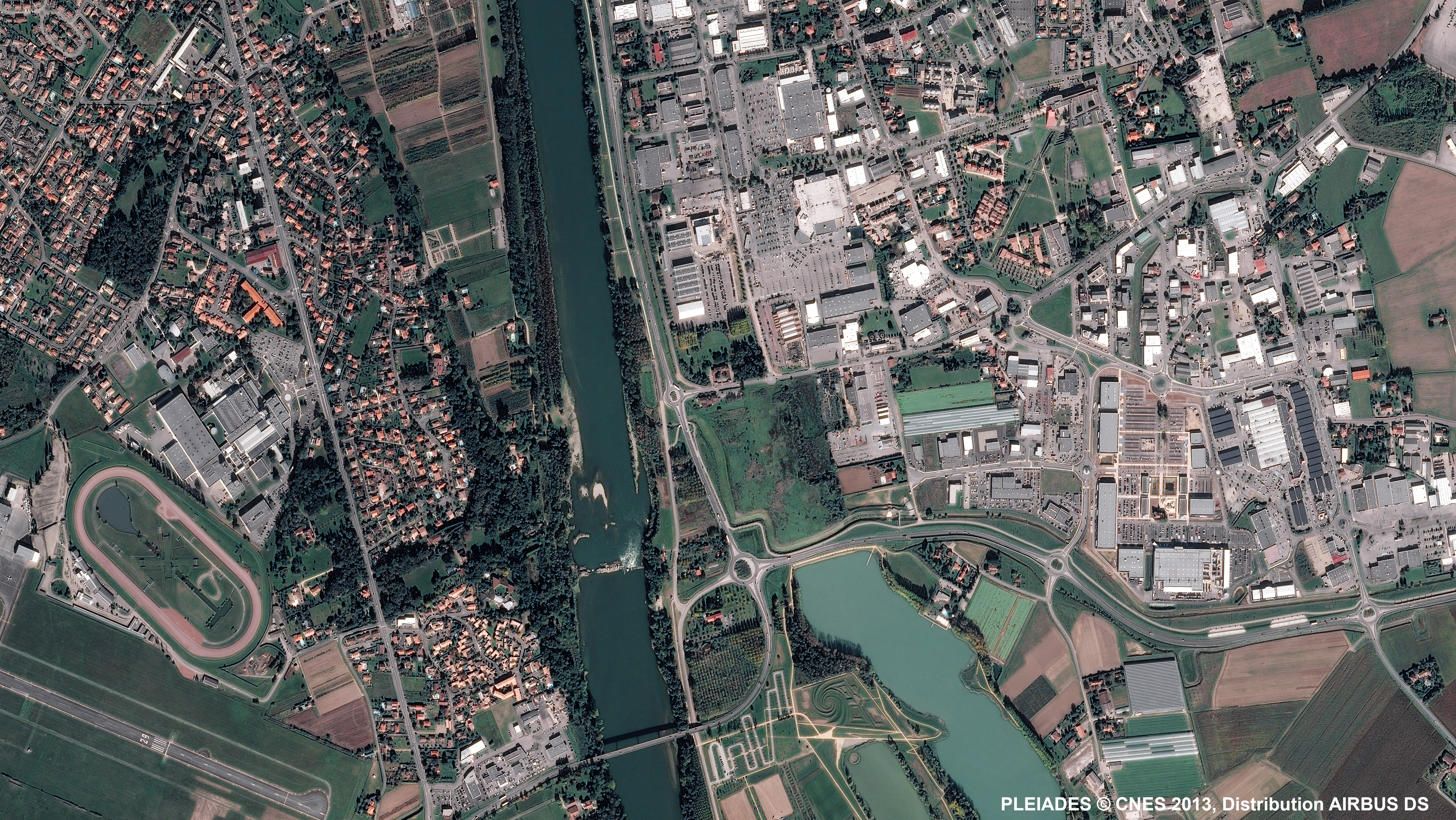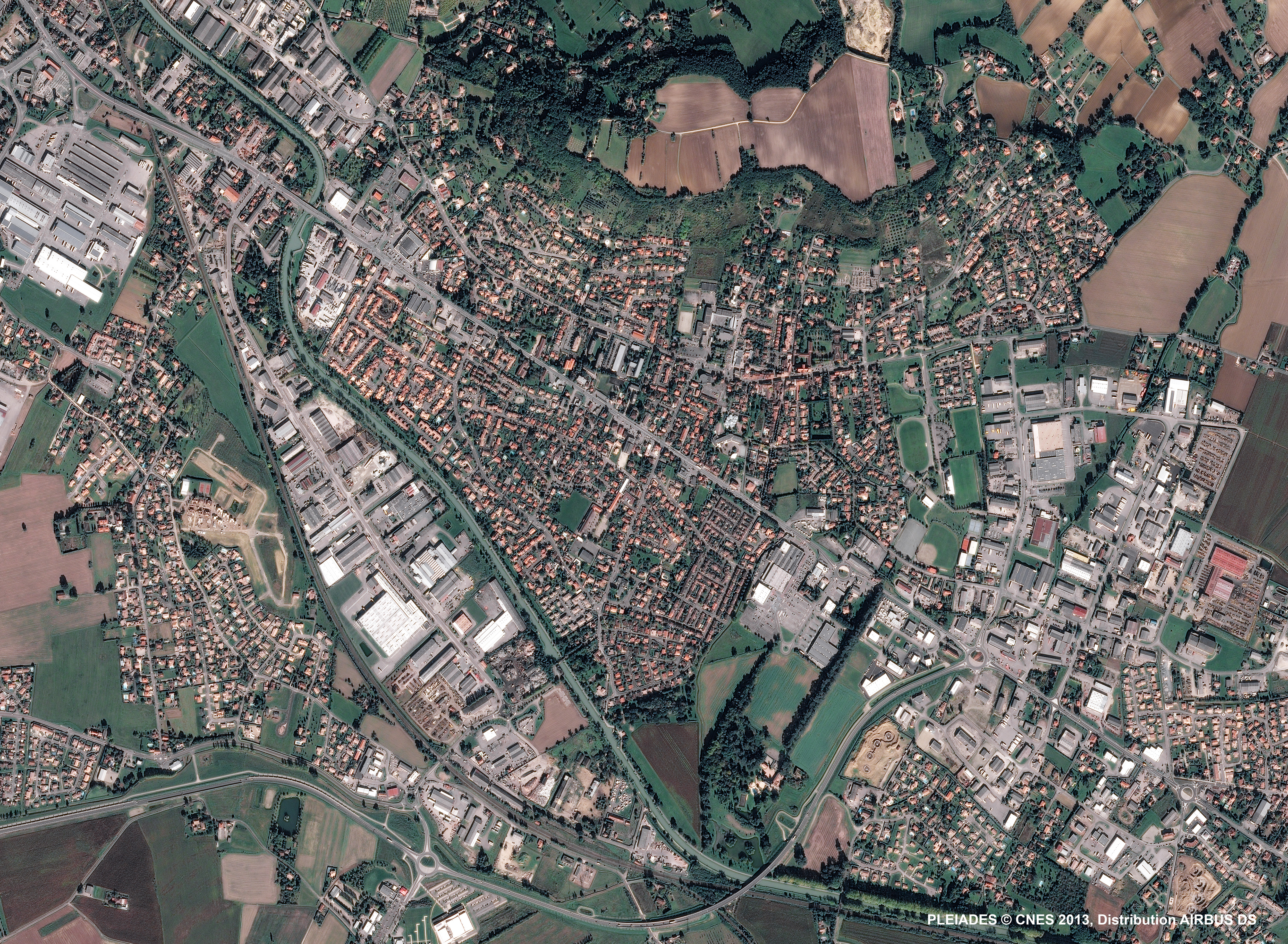 Cette image provient du satellite Pléiades, elle a été prise le vendredi 8 novembre 2013. Il s’agit d’une image en couleurs naturelles, de résolution native à 0,70m, ré-échantillonnée à 0,5m.