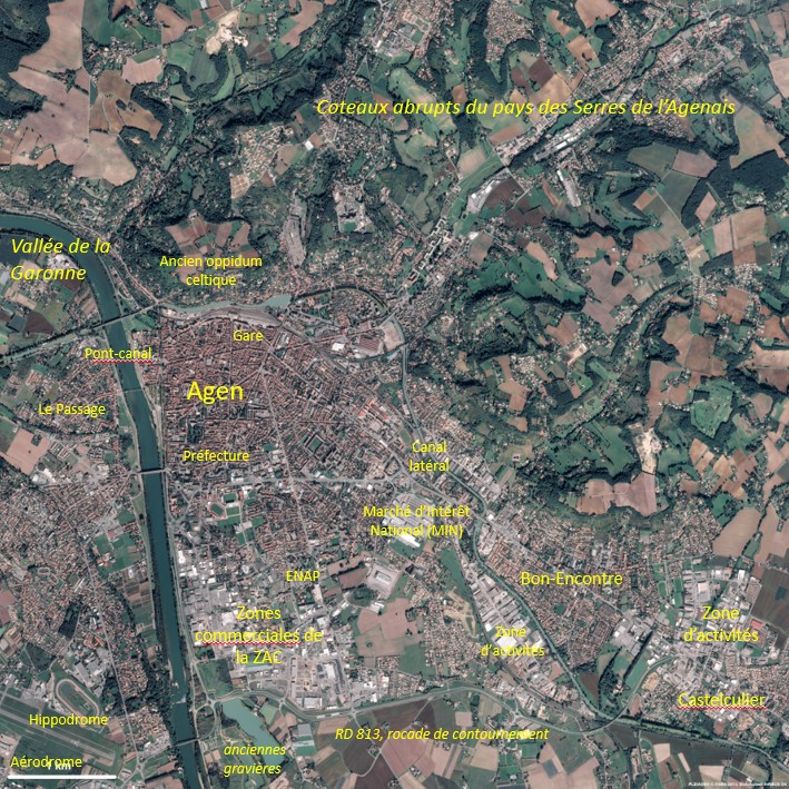 Le site d’Agen épouse celui d’Aginnum, cité gallo-romaine implantée sur la rive droite de la Garonne, dans une plaine inondable et sur quelques lambeaux de la basse terrasse. Le cœur de ville s’adosse aux coteaux abrupts du pays des Serres qui viennent rejoindre le fleuve au nord de la ville. On repère aisément au pied du coteau, les voies ferrées de la gare d’Agen (gris) et le canal latéral à la Garonne (bleu ciel) qui s’élargit en port (au nord de la gare). Plus au nord, sur le plateau, une vaste flaque brune correspond à de grandes parcelles agricoles labourées (en novembre). Elles sont installées sur l’ancien oppidum celtique de la tribu des Nitiobriges ; un site qui n’a été que brièvement occupé du II au Ier siècle av JC.
