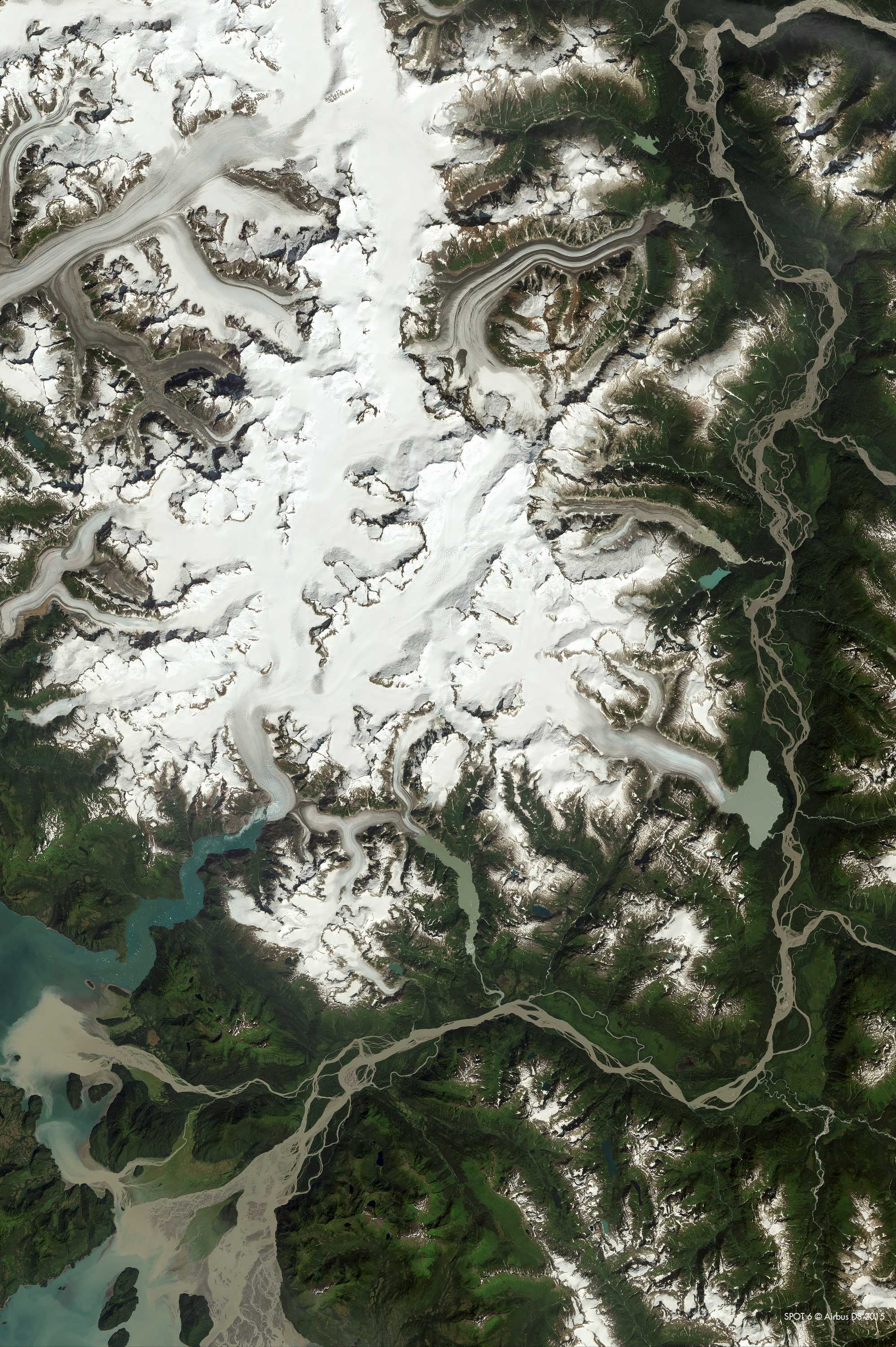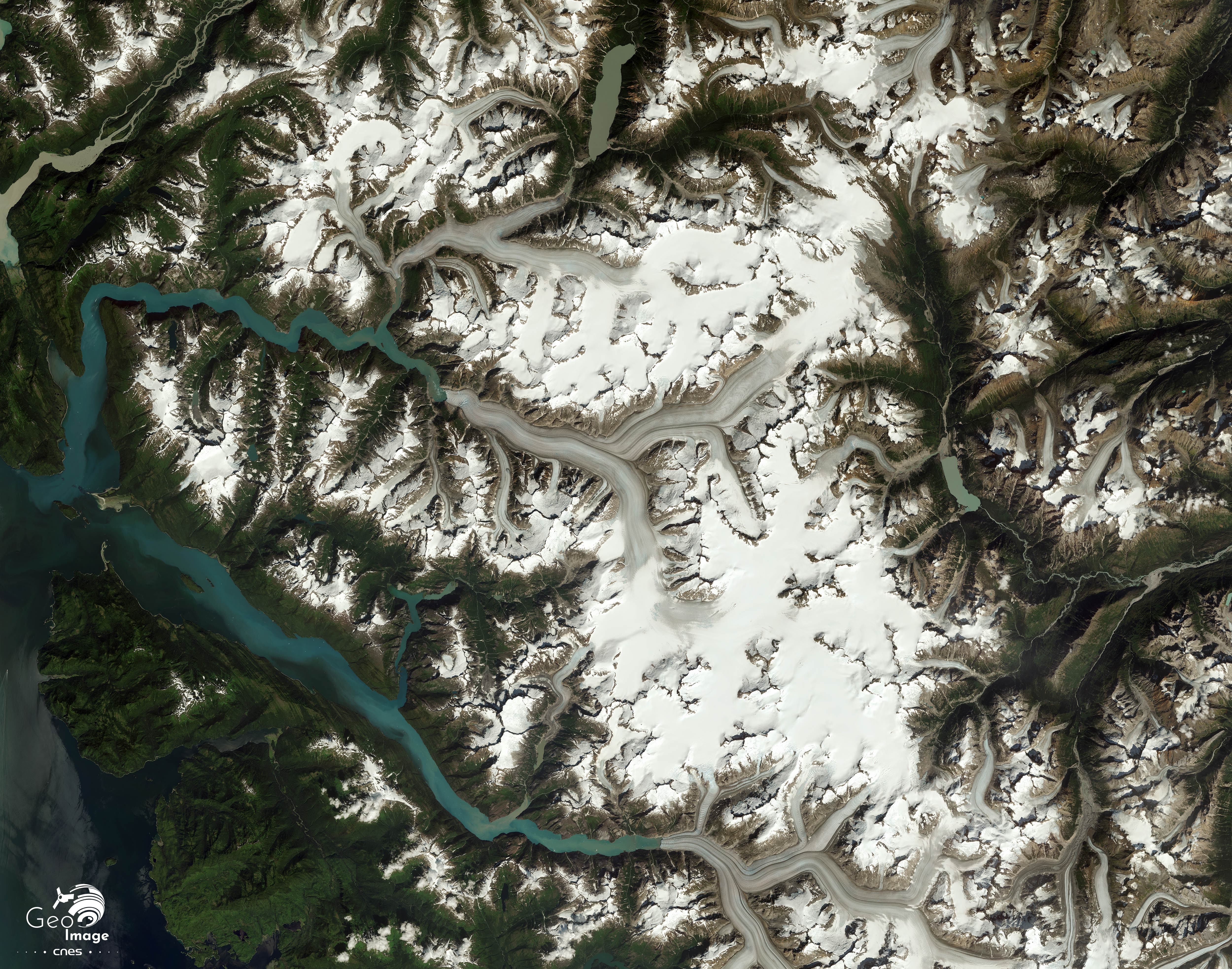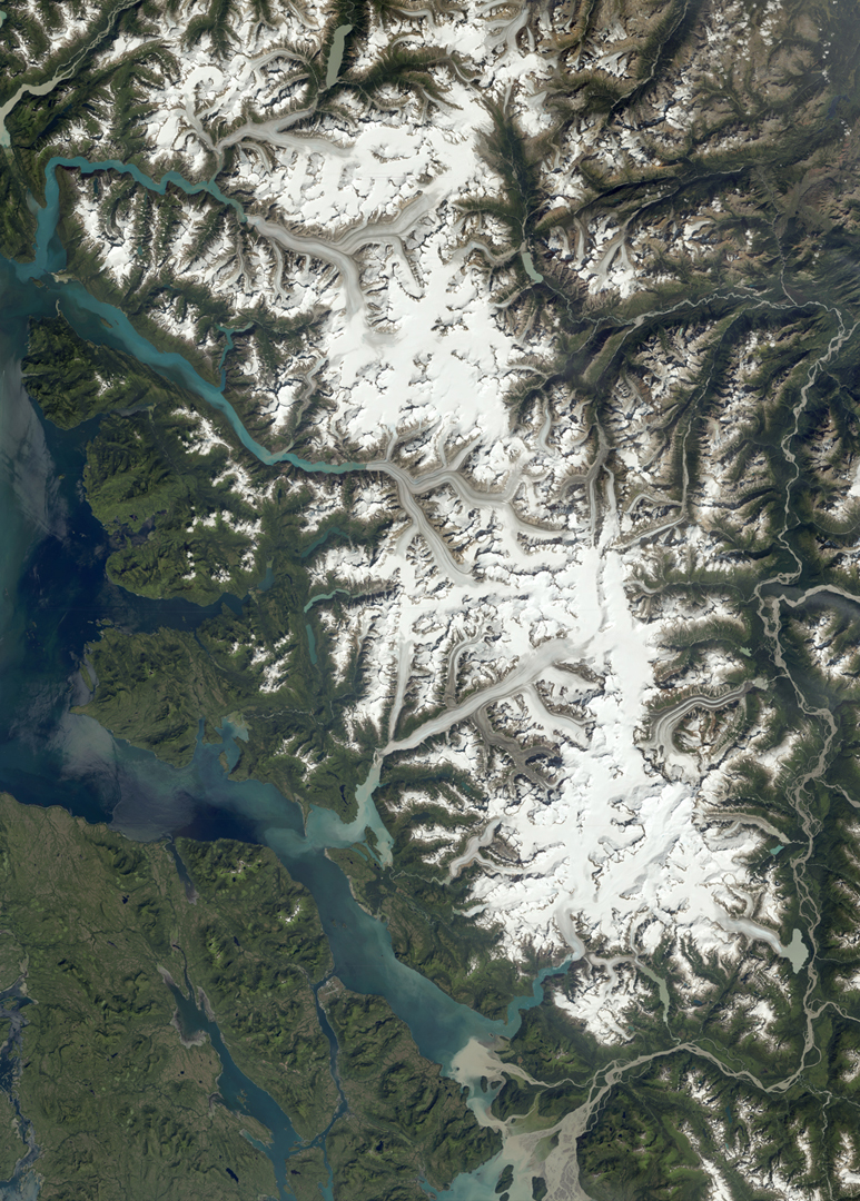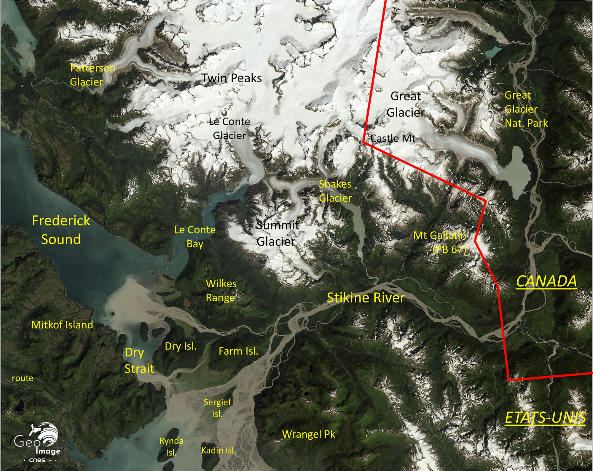 Au sud et à l’est de l’image se déploie la grande vallée de la Stikine River. Prenant sa source en Colombie britannique, elle mesure 610 km de long et draine un bassin de 52 000 km2. Sa vallée tranche la chaîne frontalière grâce à un très grand canyon. La ligne frontière entre les Etats-Unis et le Canada passe à peu près au grand coude qu’effectue la Stikine River après avoir très longtemps suivi un tracé nord/sud assez rectiligne.