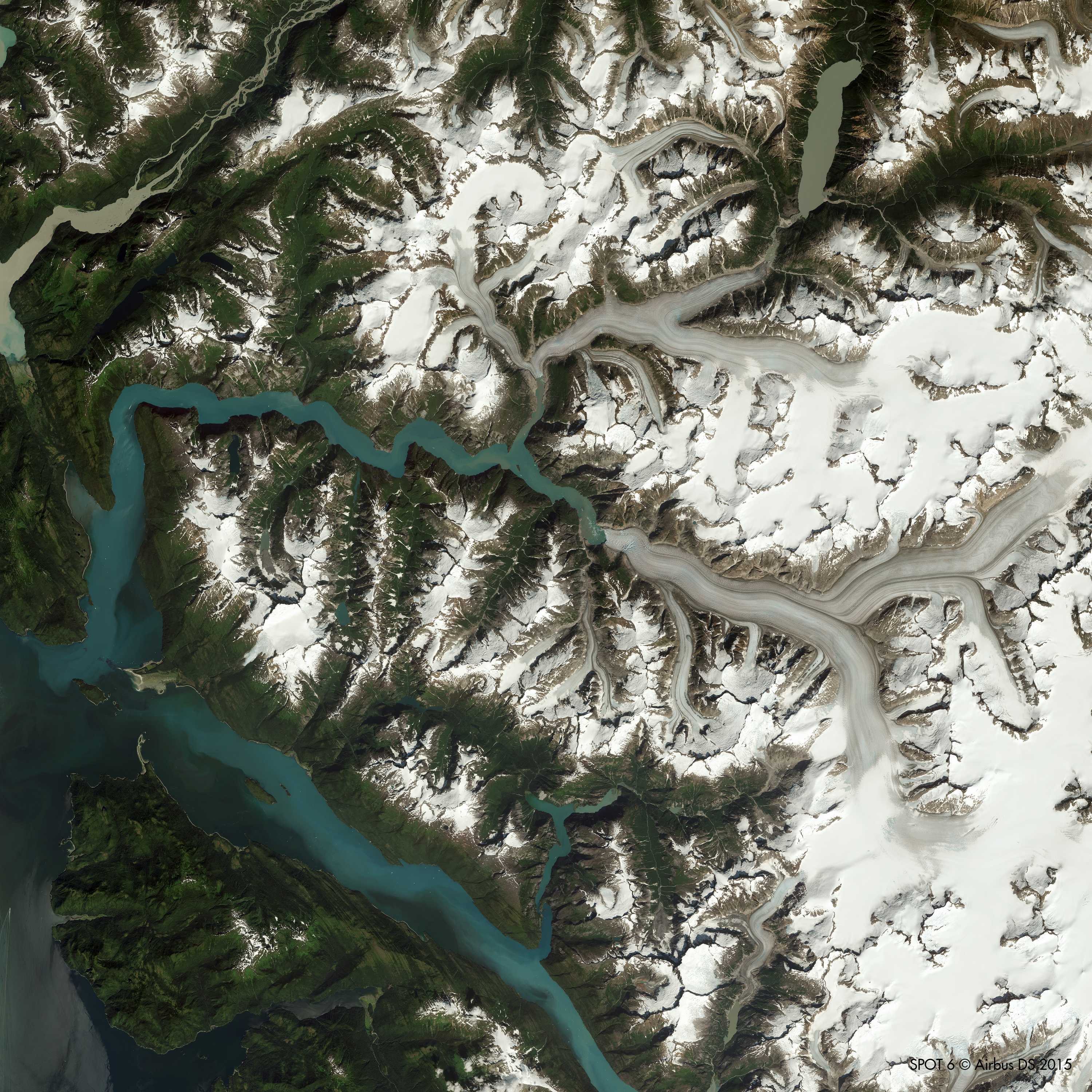 A l’est de l’image apparaît un vaste piémont montagneux. Nous sommes ici au Canada, aux marges nord-ouest de l’Etat fédéré de la Colombie britannique. La partie canadienne de l’image est organisée et drainée par une grande vallée qui coule nord-sud avant d’obliquer vers l’ouest pour se jeter tout au sud de l’image aux Etats-Unis dans la mer : c’est la fameuse Stikine River Valley. En parvenant à couper la chaine montagnarde côtière, c’est un des rares points de passage entre les Etats-Unis et le Canada.