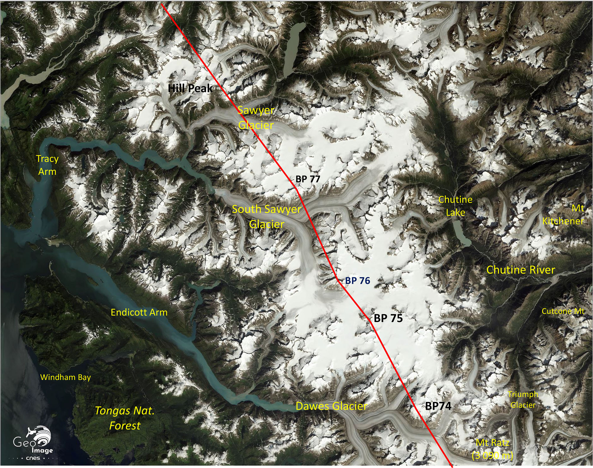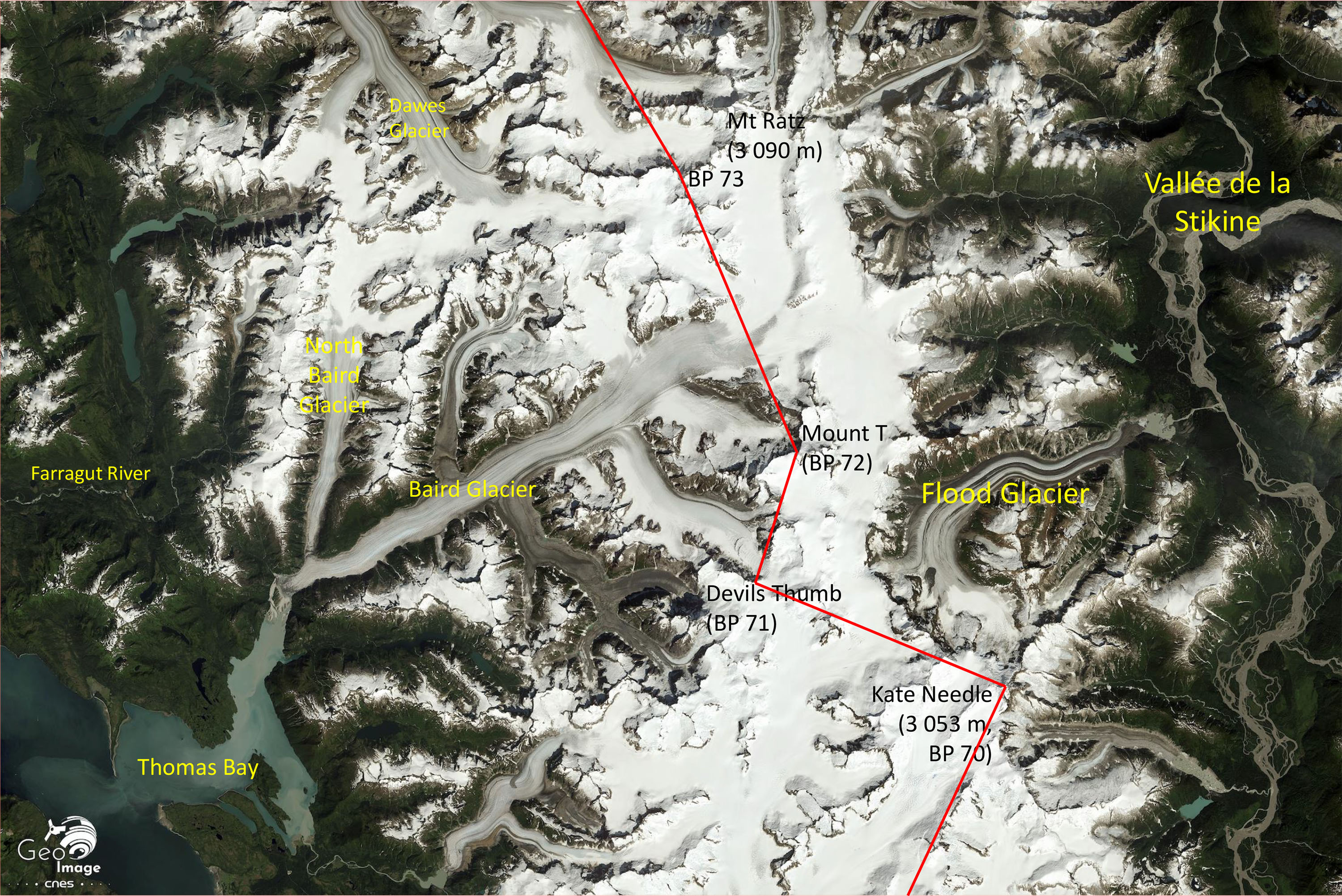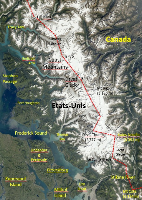 Cette logique pionnière se retrouve dans le tracé de la frontière, un tracée au cordeau très rectiligne donc qui s’appuie sur un certain nombre de hauts sommets bien identifiables et situés à peu prêts sur la ligne de crête des massifs. Du sud au nord, on part ainsi du Mont Cote à 1334 m pour rejoindre par bonds le Kates Needle (3 053 m) puis le Devis Thump (2 777 m). Sur le haut plateau glaciaire lui même, de nombreux sommets n’ont même pas de noms, ce sont les BP. Ces Boundary Peaks s’échelonnent ainsi sur les montagnes qui bornent les 2 475 km de frontières entre l’Alaska et le Canada. Ici, les BP s’échelonnent du BP 71, 72, 73, 74, 75 76… Dans le dossier de Géoimage en ligne sur le Malaspina et sa région, qui se trouvent plus au nord-ouest, nous arrivons aux BP 182 ou 183…