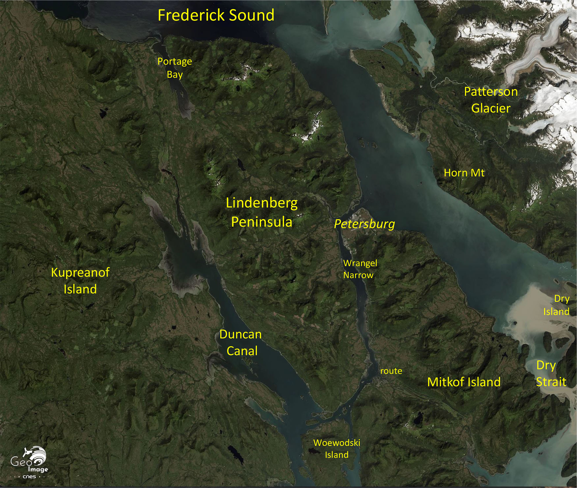 Le sud-ouest de l’image est constitué de deux grandes iles. La plus à gauche est l’île de Kupreanof. La plus petite au centre sud de la carte est l’île de Mitkof, qui est bordée par une partie des sédiments rejetés dans le fjord par la Stikine River. L’île de Mitkof est séparée de l’île de Kupreanof par un très étroit bras de mer : le Wrangell Narrow.
