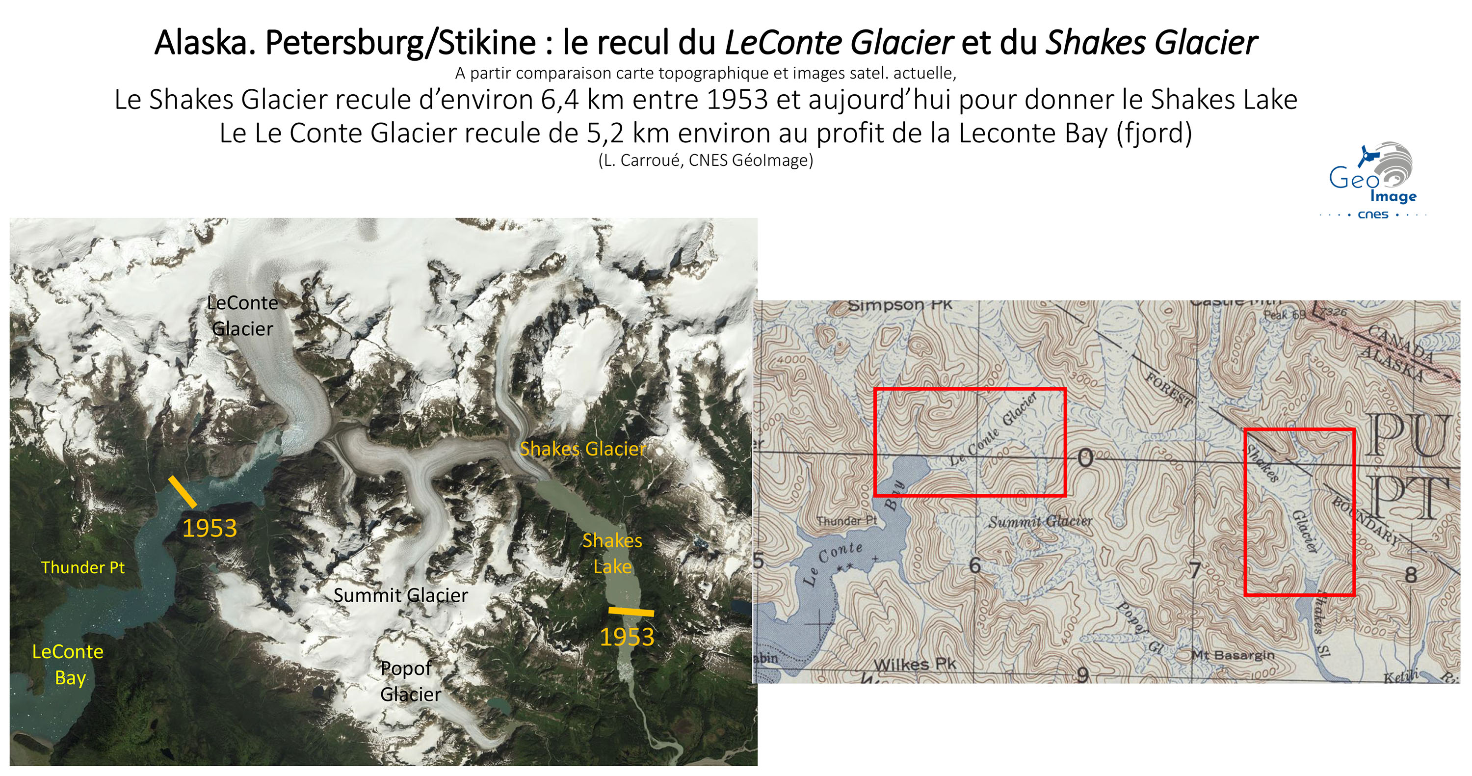 La comparaison avec la carte topographique de Sumdum de 1951 de l’USGS et l’image Sentinelle permet la mise en évidence d’un recul de 3,4 km du Sawyer Glacier et de 4,5 km du South Sawyer Glacier. Si le recul des langues glaciaires est spectaculaire et bien visible, il convient aussi de noter la forte régression en épaisseur des glaciers et de l’englacement des plateaux glaciaires. Si ce processus est moins spectaculaire, il est relativement trés important par les volumes de glaces et d’eau de fonte concernés.