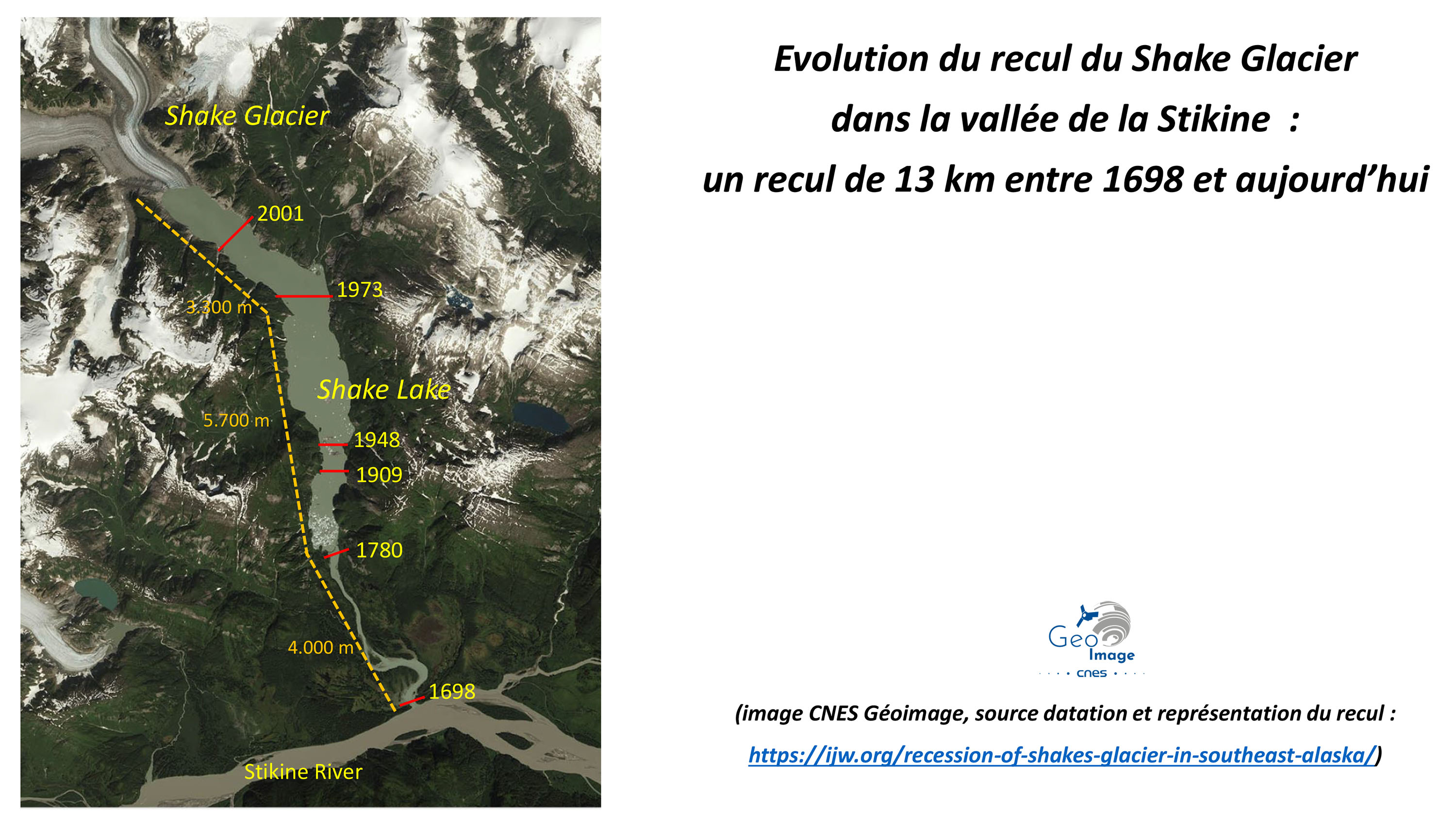 Entre 1698 et aujourd’hui, le Shake Glacier recule 13 km, donnant ainsi naissance au très vaste et long Shake Lake. Entre 1953 et aujourd’hui, le LeConte Glacier recule pour sa part de 5,2 km au profit du puissant fjord - terme qui définit justement une vallée glaciaire envahie par la mer - de la LeConte Bay.