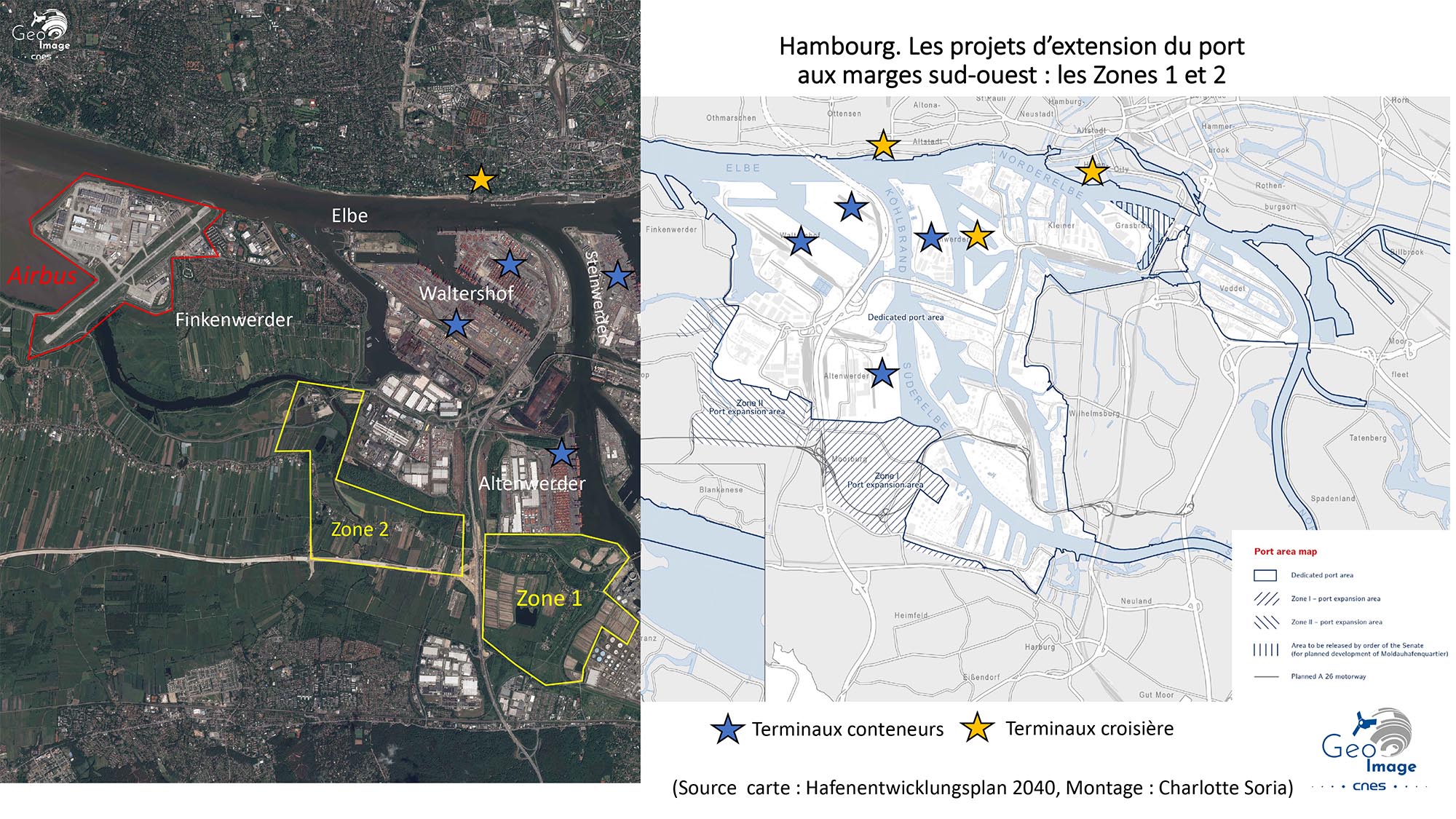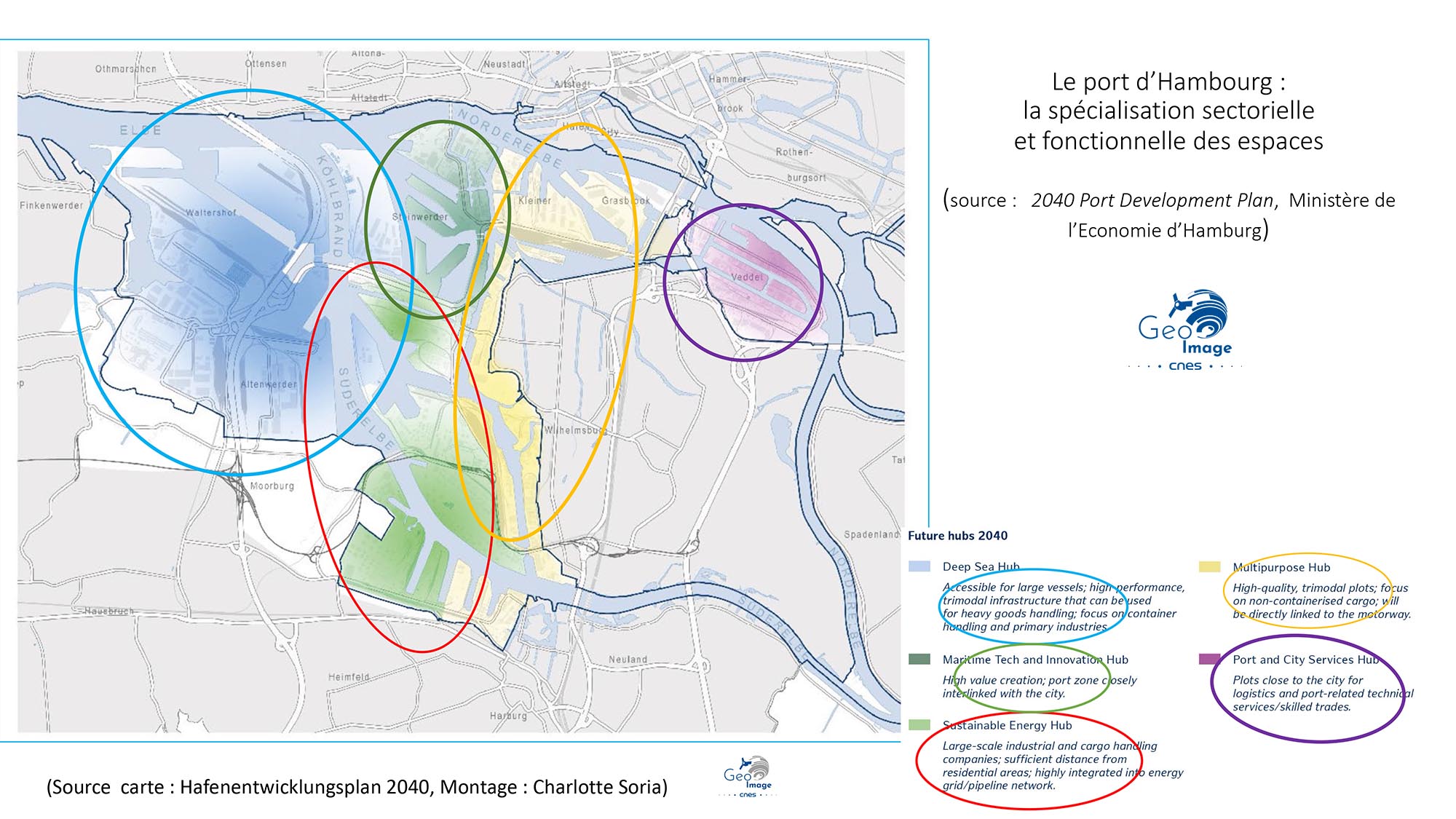 Comme le montrent bien à la fois les images et la carte de la spécialisation sectorielle et fonctionnelle du port issu du grand plan d’aménagement 2040, nous sommes ici dans la partie la plus occidentale du port, la plus proche et la plus accessible en venant de la mer. C’est le « Deep Sea Hub ». Il s’oppose d’un côté aux installations fluviales ou fluvio-maritimes centrées sur le bras méridional de l’Elbe (Süderelbe) et de l’autre aux espaces portuaires du Veddet les plus proches du centre et en voie de reconversion vers des fonctions métropolitaines plus sélectives.