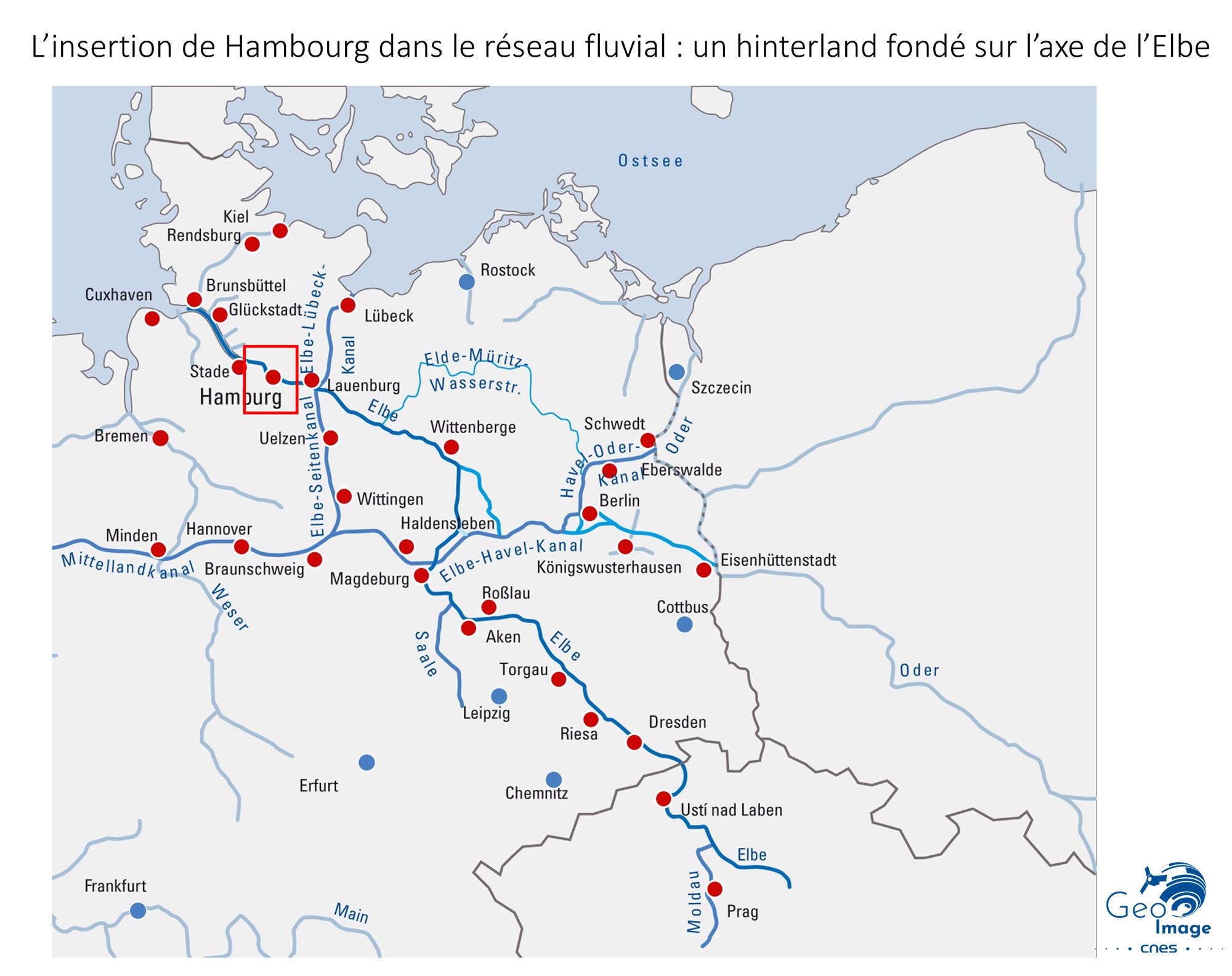 Hambourg est en effet toujours dans son site historique de fond d’estuaire sans avoir connu comme bien d’autre ports un glissement de ses activités portuaires de l’amont vers l’aval. Le site historique correspond classiquement au lieu d’épuisement de l’effets des marées en fond d’estuaire, tout comme à Rouen pour la Seine ou Londres pour la Tamise. A ceci s’ajoute un site de gué nord/sud bien visible sur l’image puisque l’Elbe se sépare en plusieurs bras dans un large lit majeur plat et humide, facilitant ainsi le franchissement du fleuve.