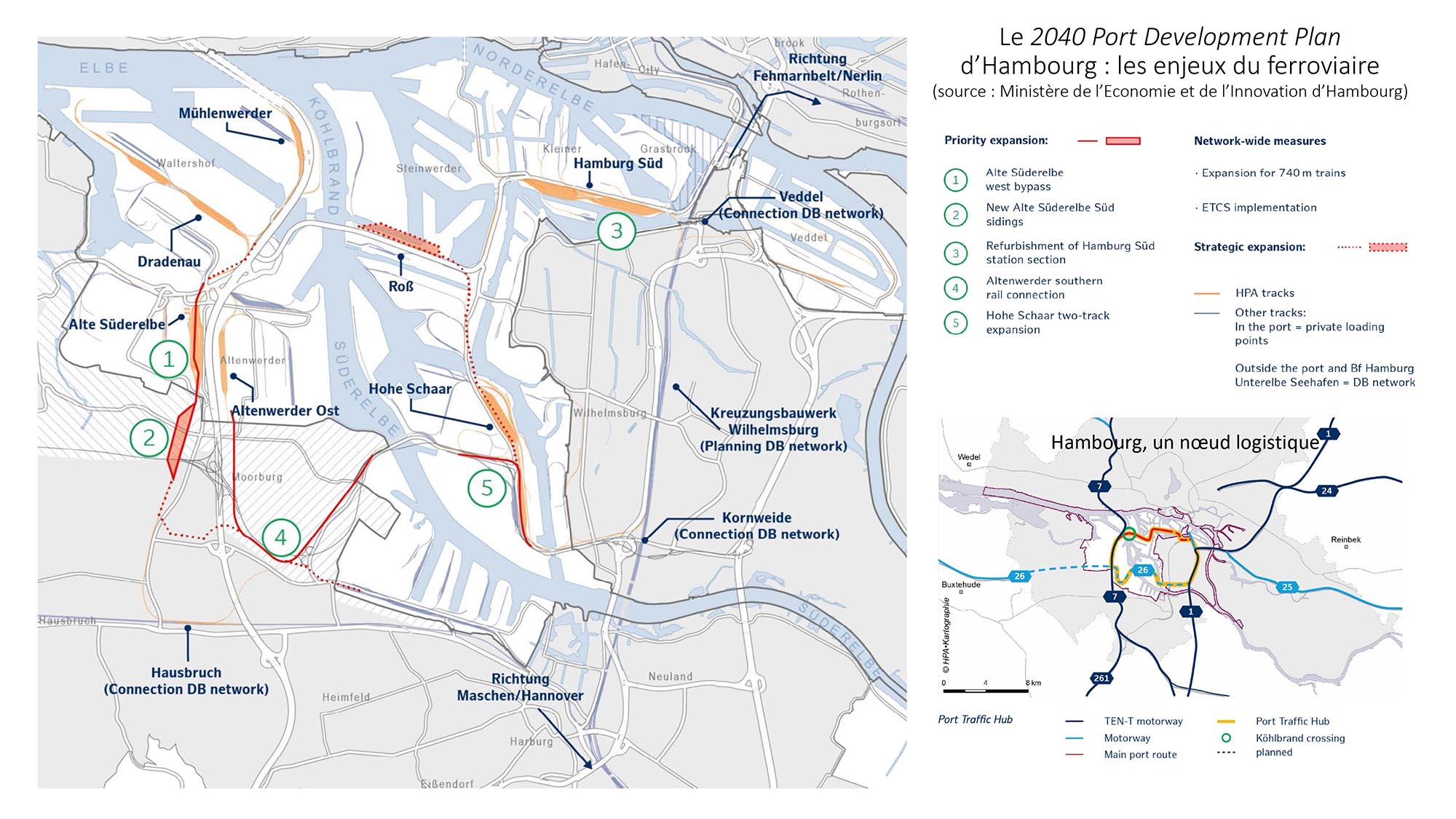 Enfin, le Hafenentwicklungplan 2040 élaboré par les autorités portuaires nous renseigne sur les importants projets d’agrandissement qui sont aujourd’hui programmé au sud (cf. zone 1 et zone 2) et qui représentent des superficies considérables prises sur les espaces agricoles périphériques.