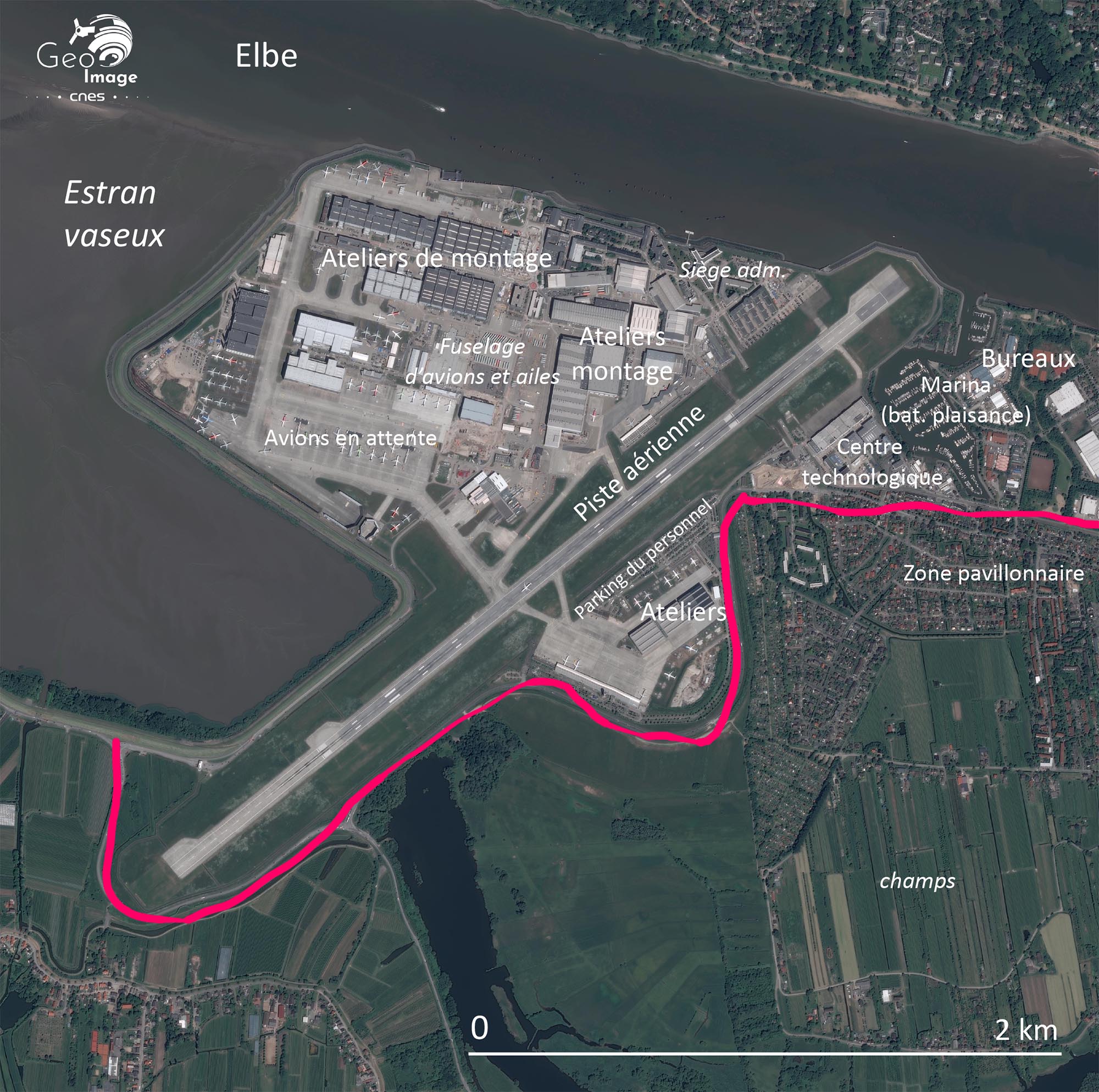 Airbus à Hambourg constitue une ville dans la ville tout en occupant un site difficile, l’ancienne île de Finkenwerder. Se trouvent sur 3,7 km2, plus d’une centaine de bâtiments, environ 15 000 salariés, une piste et un terminal roulier (ro-ro) où accostent les bateaux dédiés au transport des pièces aéronautiques.