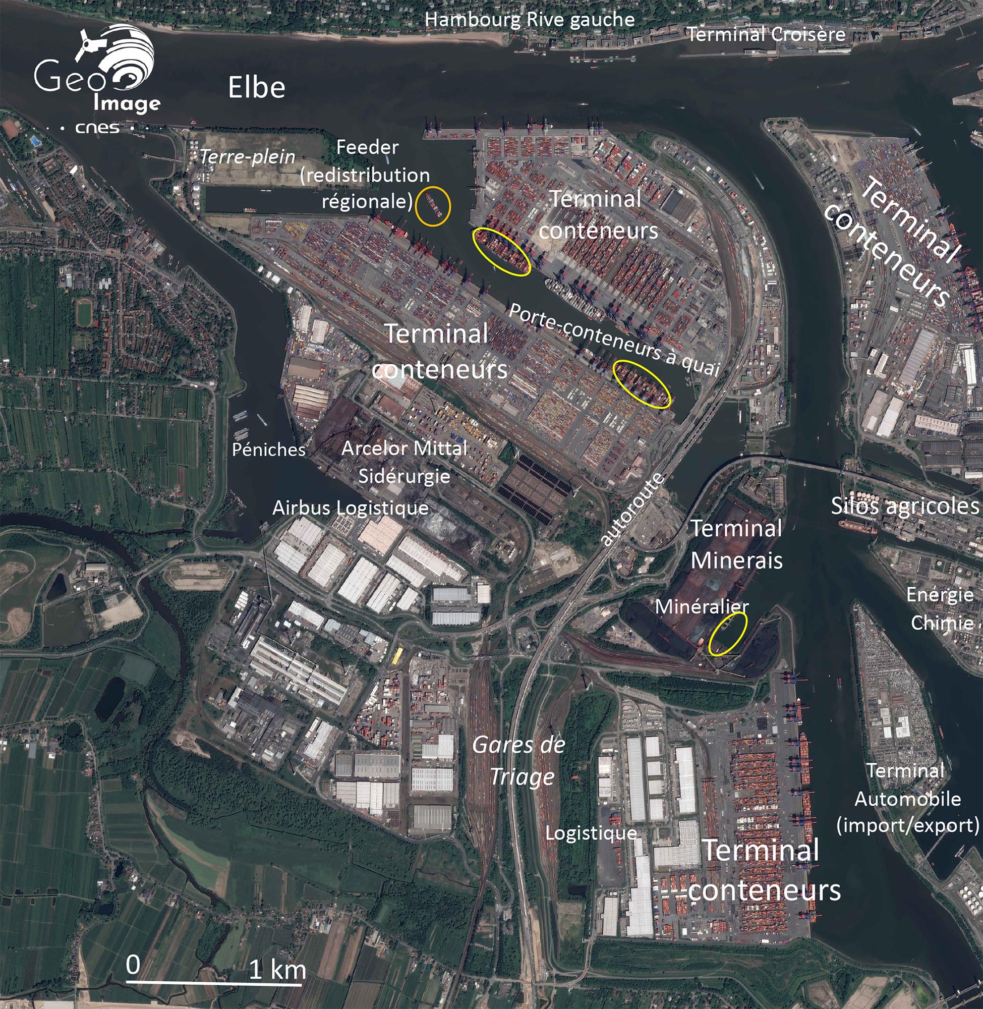 Particulièrement bien visibles, les quatre terminaux à conteneurs du port sont connectés au foreland mondial. Ici nous n’en voyons qu’une partie, avec d’Ouest en Est le Terminal Eurogate (1,4 km2 de stockage, 21 grues à portique pour le transbordement, 2 080 m de quai), puis le terminal à conteneur d’HHLA sur le Burchardkai (1,4 km2, 27 grues portiques, 2 850 m de quai) et de l’autre côté du chenal de navigation le terminal Tollerort (14 grues à portiques, 1 km2 de zone de stockage, 1 240 m de quai). Ces deux derniers ainsi que le fleuron automatisé des terminaux de la HHLA, l’Altenwerder (2001), plus au sud (14 grues à portiques, 1 km2 de zone de stockage, 1 400 m de quai), sont gérés par un opérateur public, puisque le HGV (Hamburger Gesellschaft für Vermögens- und Beteiligungsmanagement mbH), le groupe d’économie publique de la ville-Land de Hambourg, en possède 69,6 % des parts. L’acteur majeur de l’aménagement reste donc un acteur public en charge de la politique portuaire et métropolitaine.