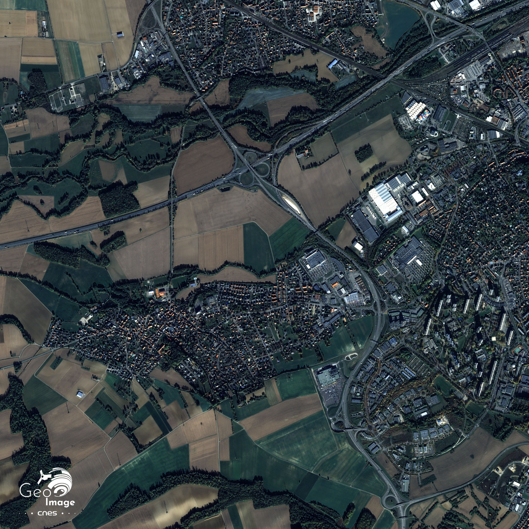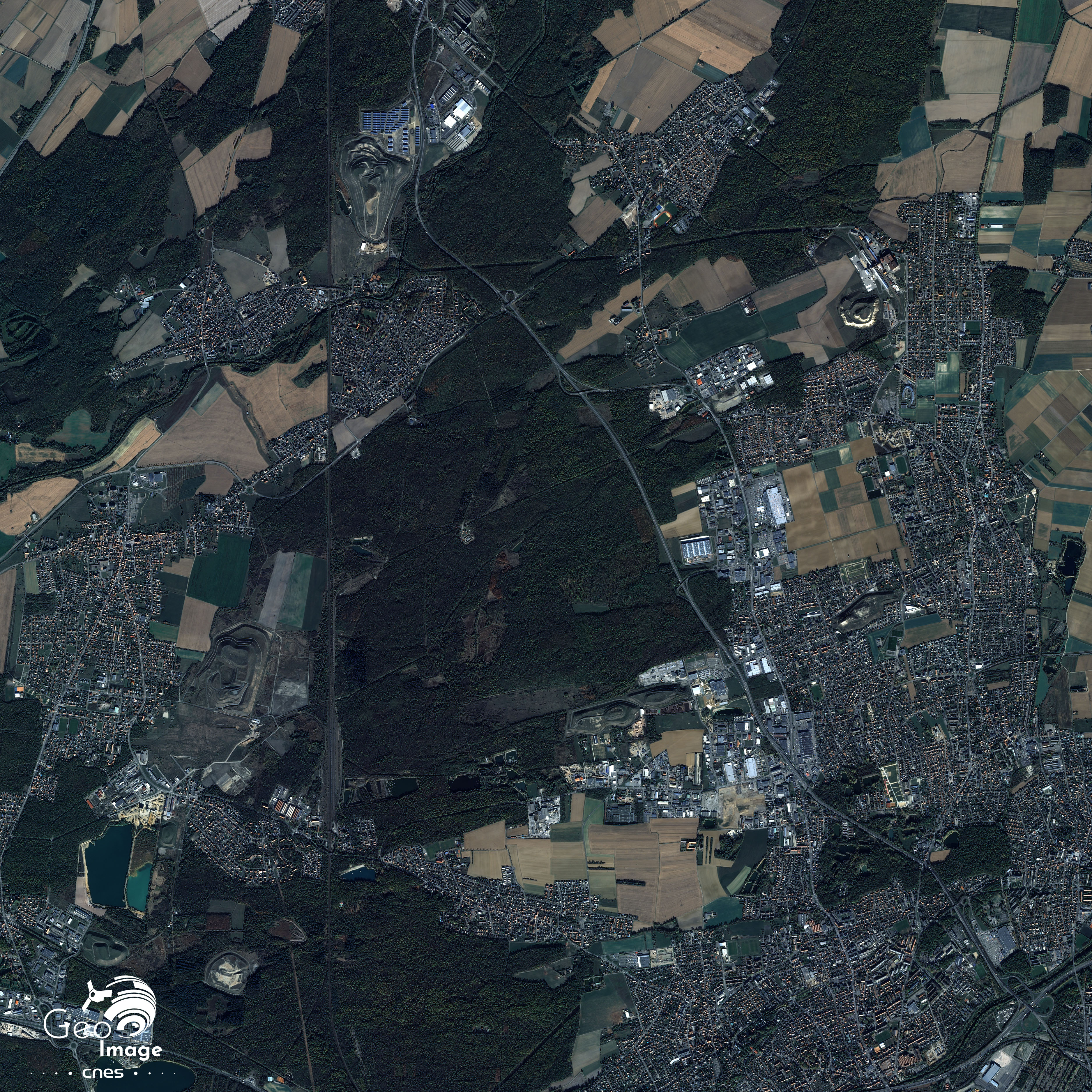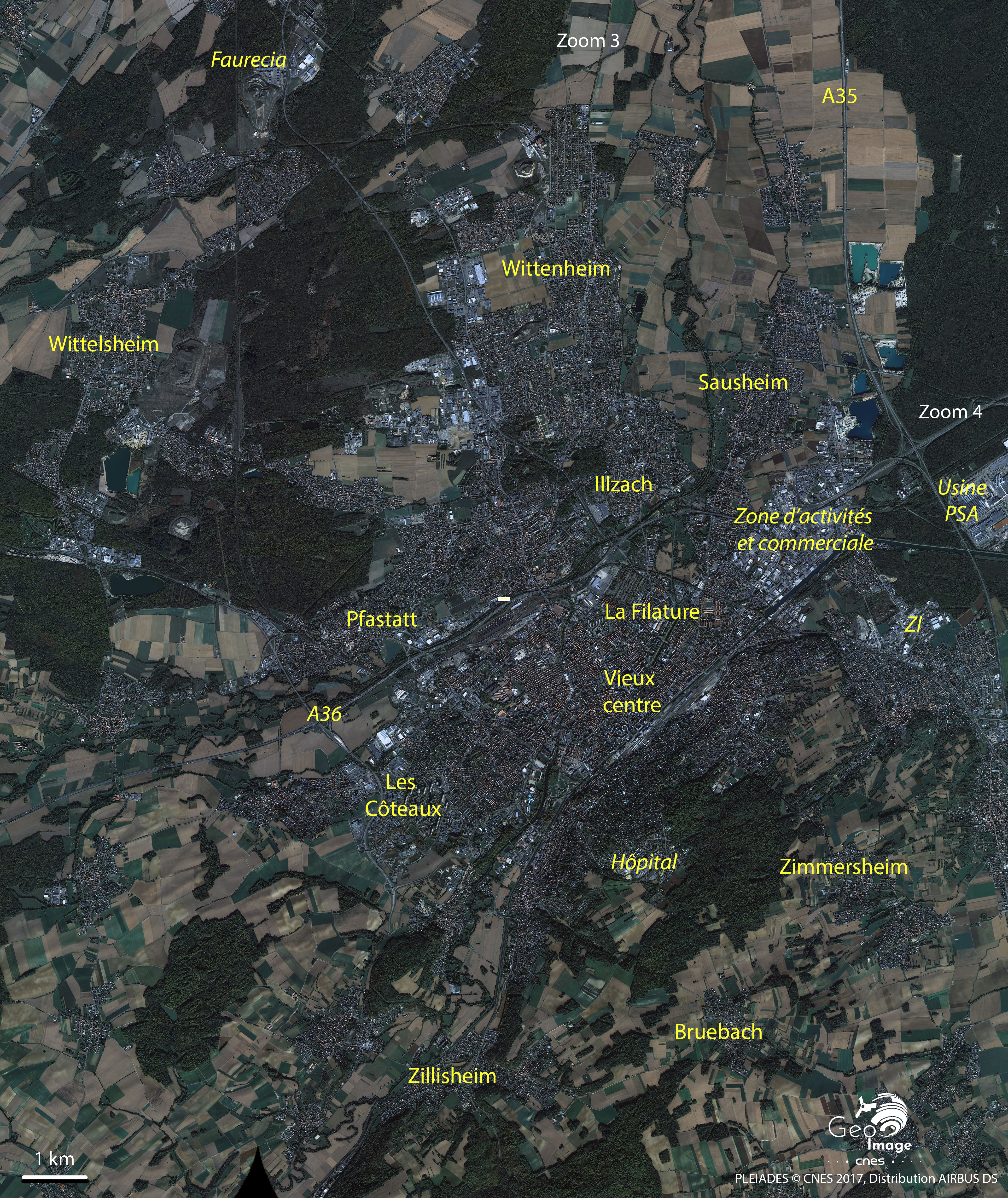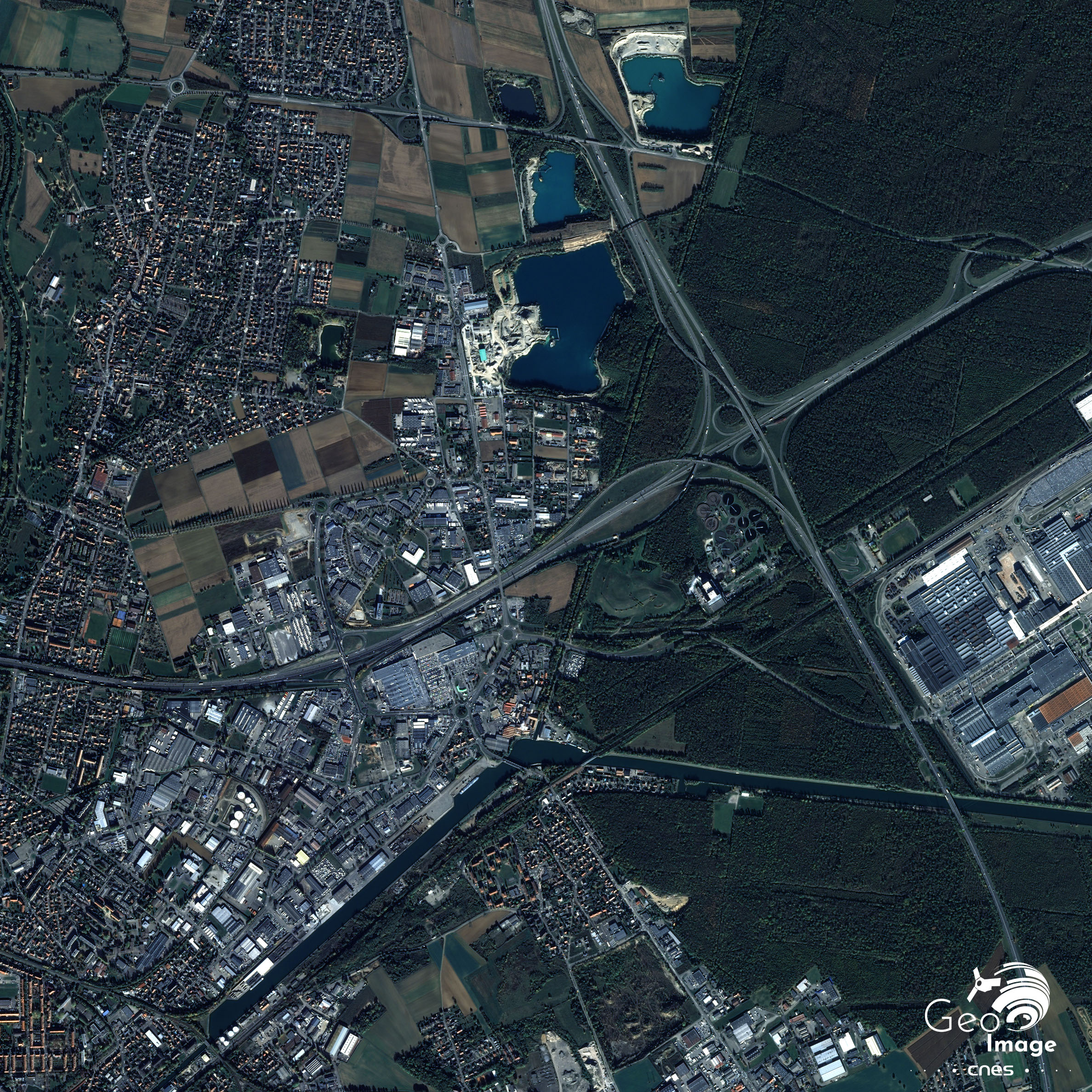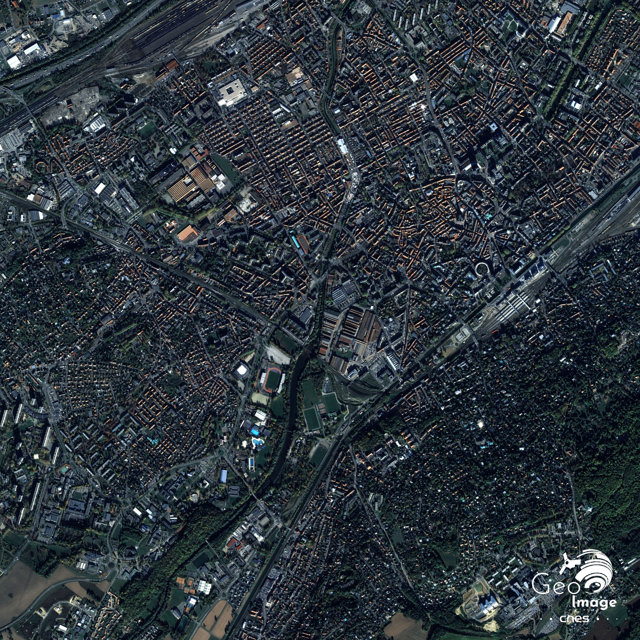 Ci-dessous, l'image satellite Pleiades, présente quelques repères géographiques de l'agglomération située dans le Nord -Est de la France, près des frontières suisse et allemande :
