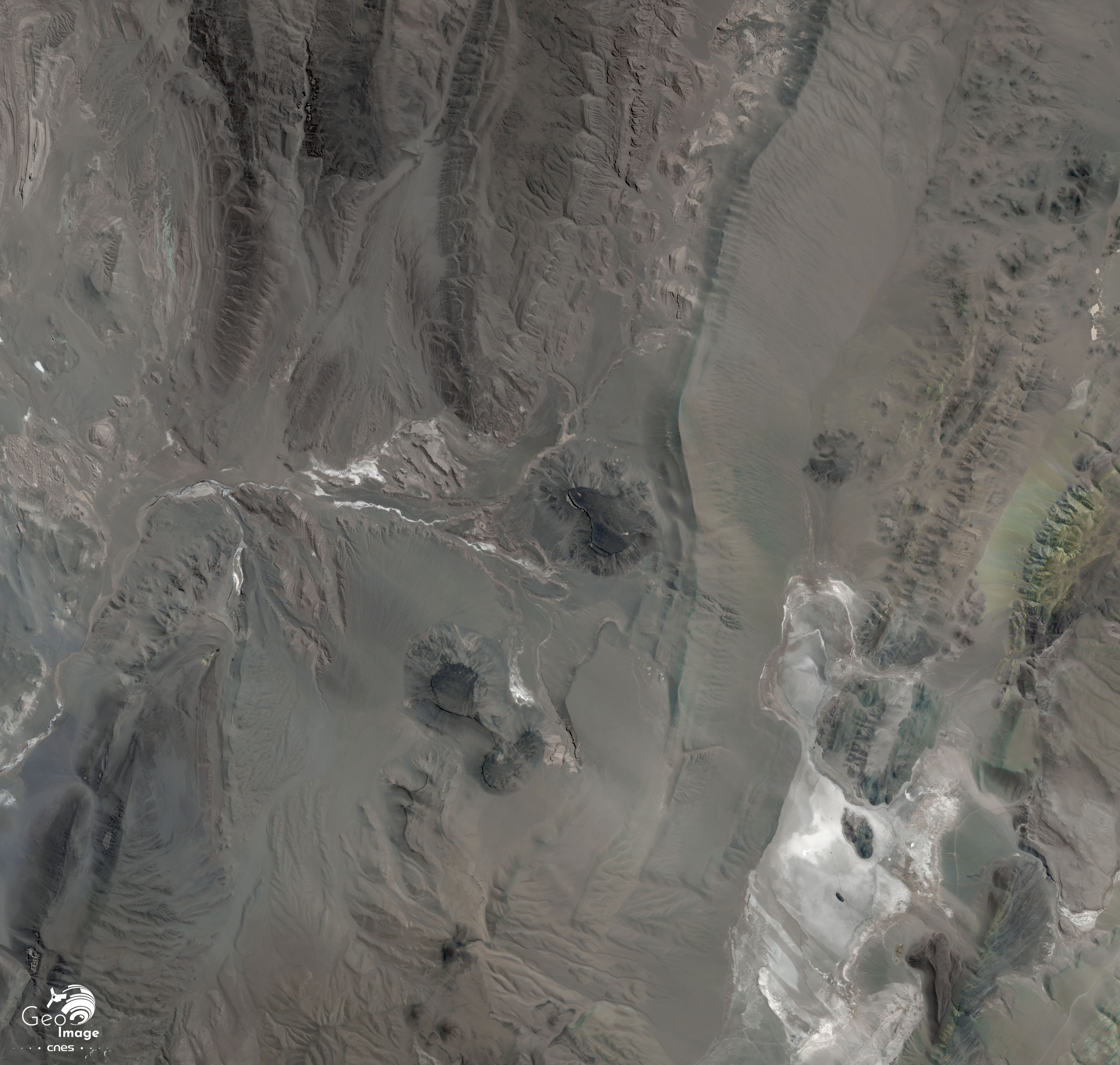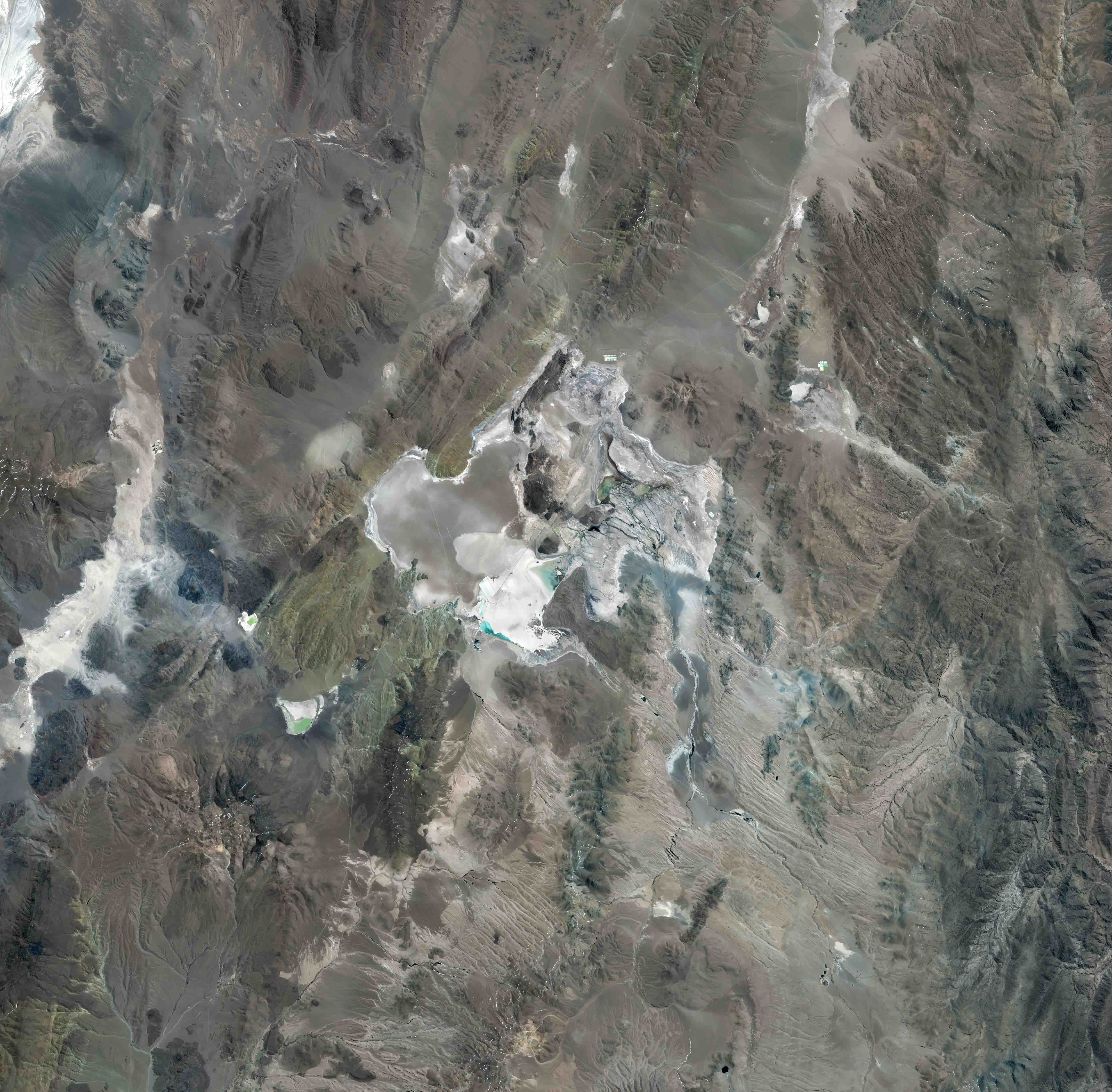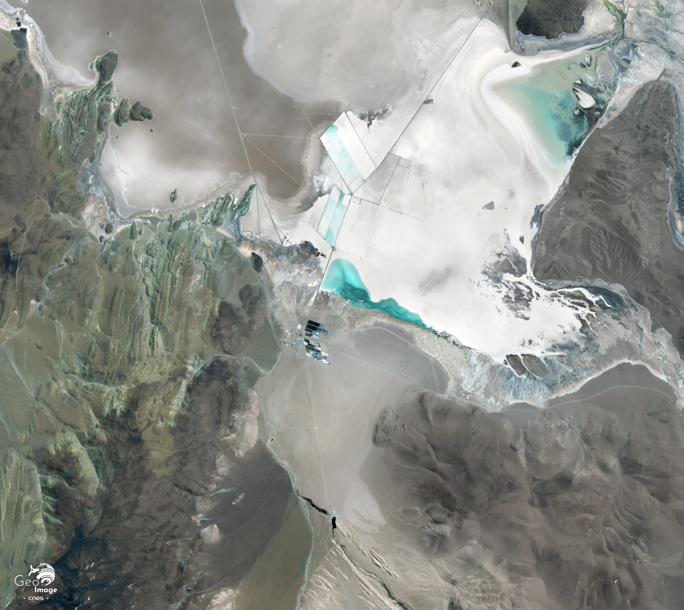 Cette image montre le salar Diablillos, situé au Nord-Est du salar Hombre Muerto, dont il est séparé par le Cerro Ratones, un sommet qui culmine à 5 092 mètres d’altitude. Là aussi, des piscines d’évaporation ont été aménagées, dans le cadre d’un projet d’exploitation de lithium. Le cas de ce petit salar illustre le phénomène de multiplication des projets d’exploitation de lithium en Argentine, qui concerne jusqu’aux plus petits salares, aux réserves modestes. Certains projets peinent toutefois à parvenir au stade d’exploitation industrielle, les investisseurs et repreneurs se succèdent rapidement.